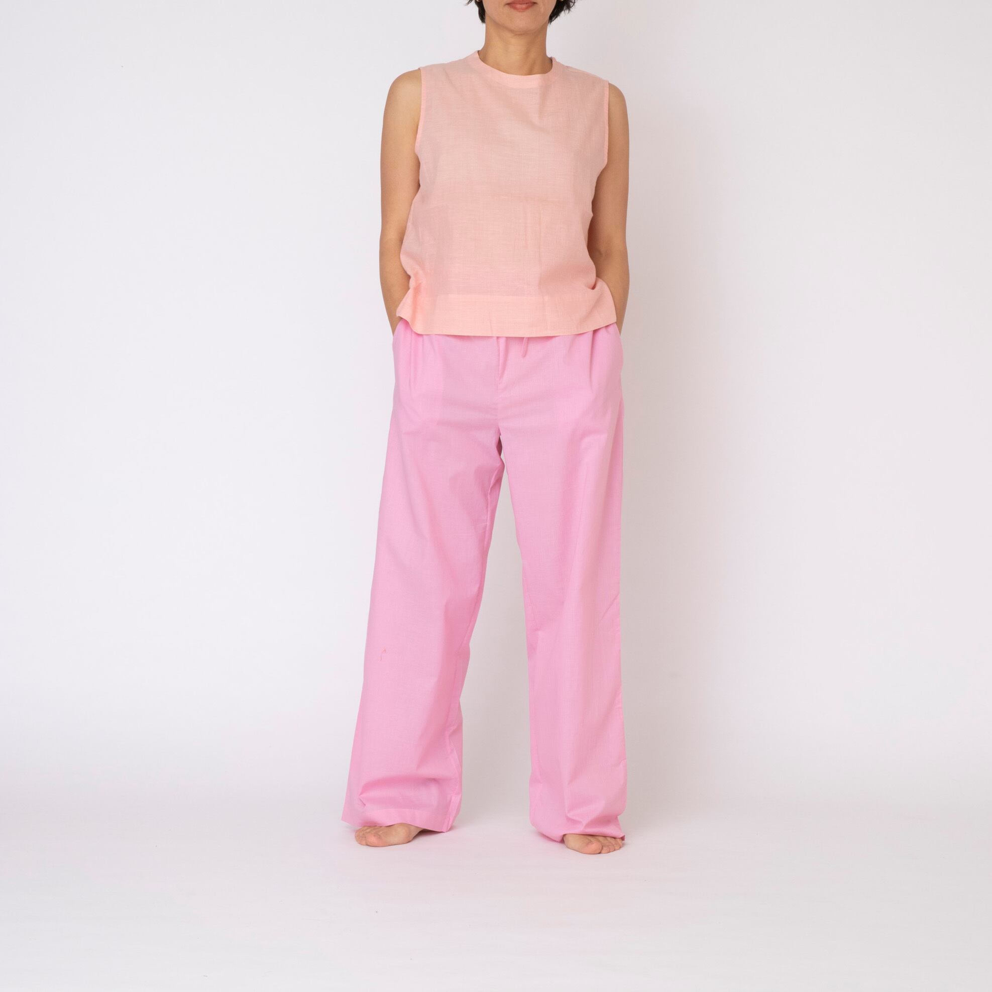 後ろにゴムが入ったリラックスボトムです。素材は、目の詰まった薄手のコットン100%。シルエットの美しさと、履きやすさを兼ね備えています。両サイドにポケットあり。