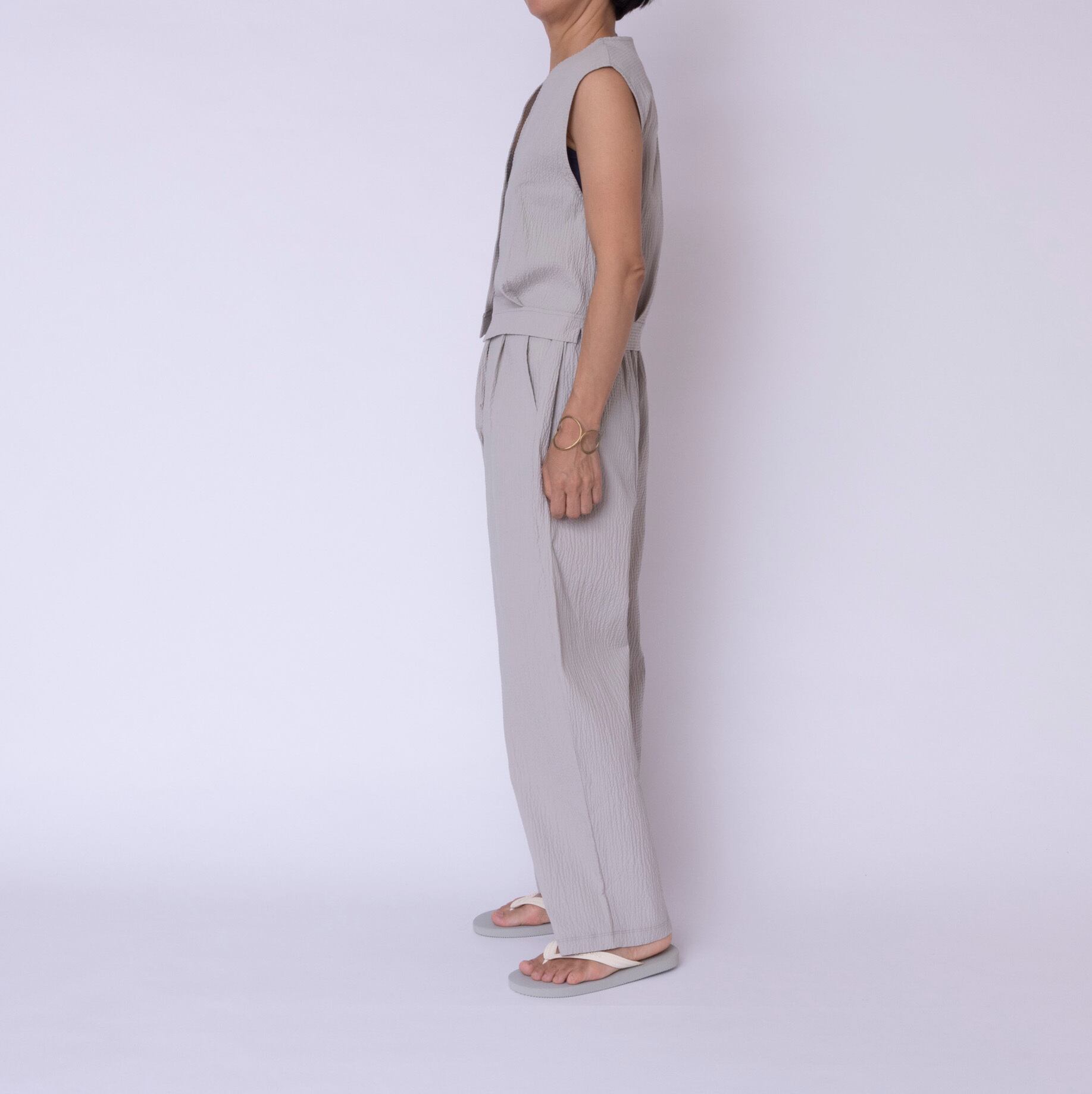 ハイウェストで適度なボリュームシルエットがバランスの良いパンツは、カジュアルにもきれいめにも着られる万能選手。フロントがラップ状になっているのがポイントです(後ろはゴム)。パンツのみで、同素材のボックスベストとセットアップで。春から夏までいろいろなスタイルで楽しまれてください。