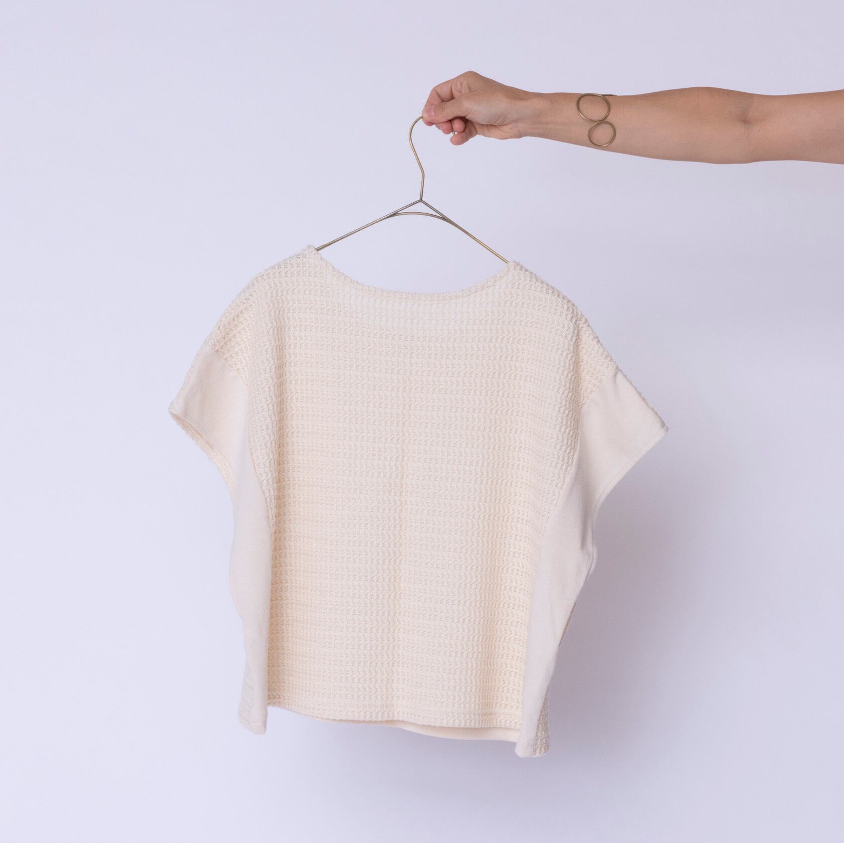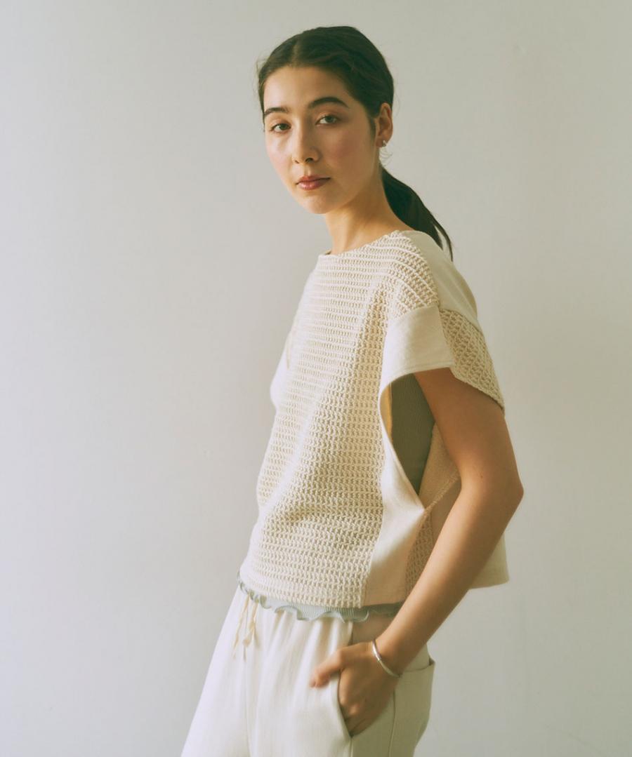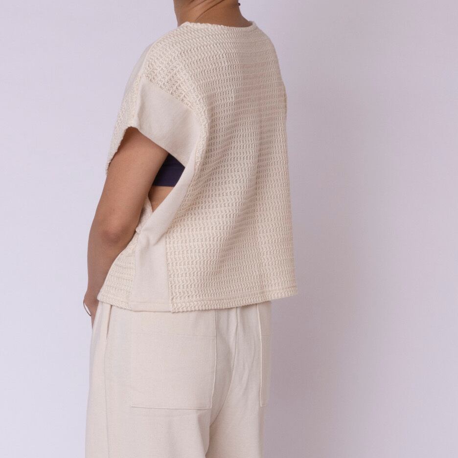 トルコ産のオーガニックコットン天竺と、ローゲージニットのようなラッセル素材の切り替えが印象的なベスト。前後で着用できる2WAY仕様です。
