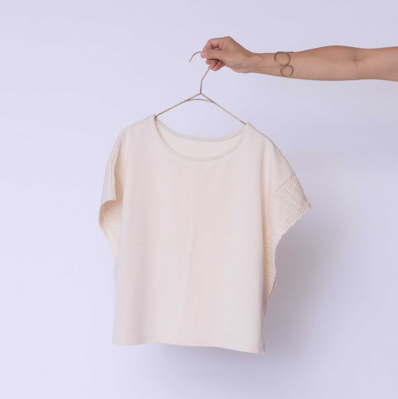 リラックス感がありながらも上品な雰囲気で、一年を通して着ていただけます。春夏はインナーで遊んで一枚で、寒い季節はロングスリーブとのレイヤードがおすすめです。アイボリーは綿かすの入ったナチュラルな生地も特徴。