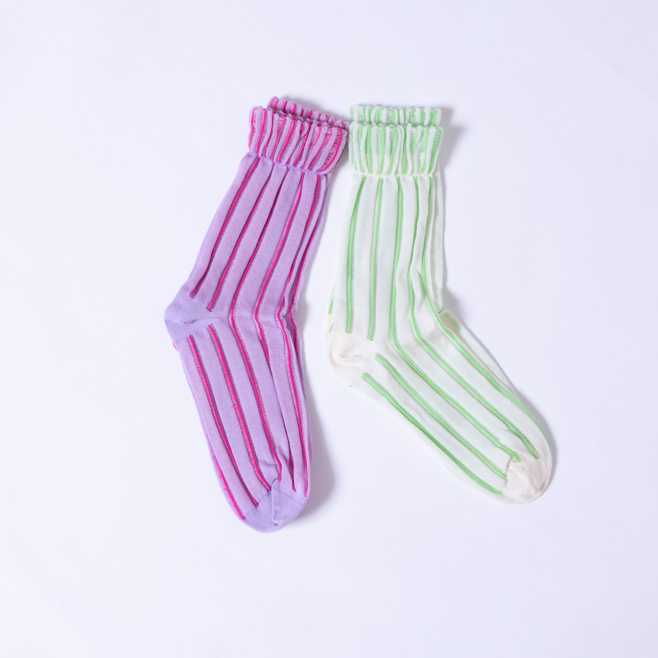コットンベースにストライプを透けさせたシアーソックス。すり硝子のようなざらりとした質感もかわいいです。無地のソックスと重ね履きしたり、素足に直接履いたり。