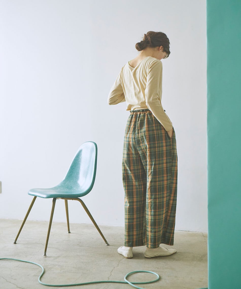 ウエストはゴム&リボン紐のイージー仕様で、肌あたり、履き心地ともに何のストレスもありません。メンズライクな雰囲気で、無地アイテムと合わせても主役になってくれるので、いつもの冬の装いを楽しく変えてくれますよ。