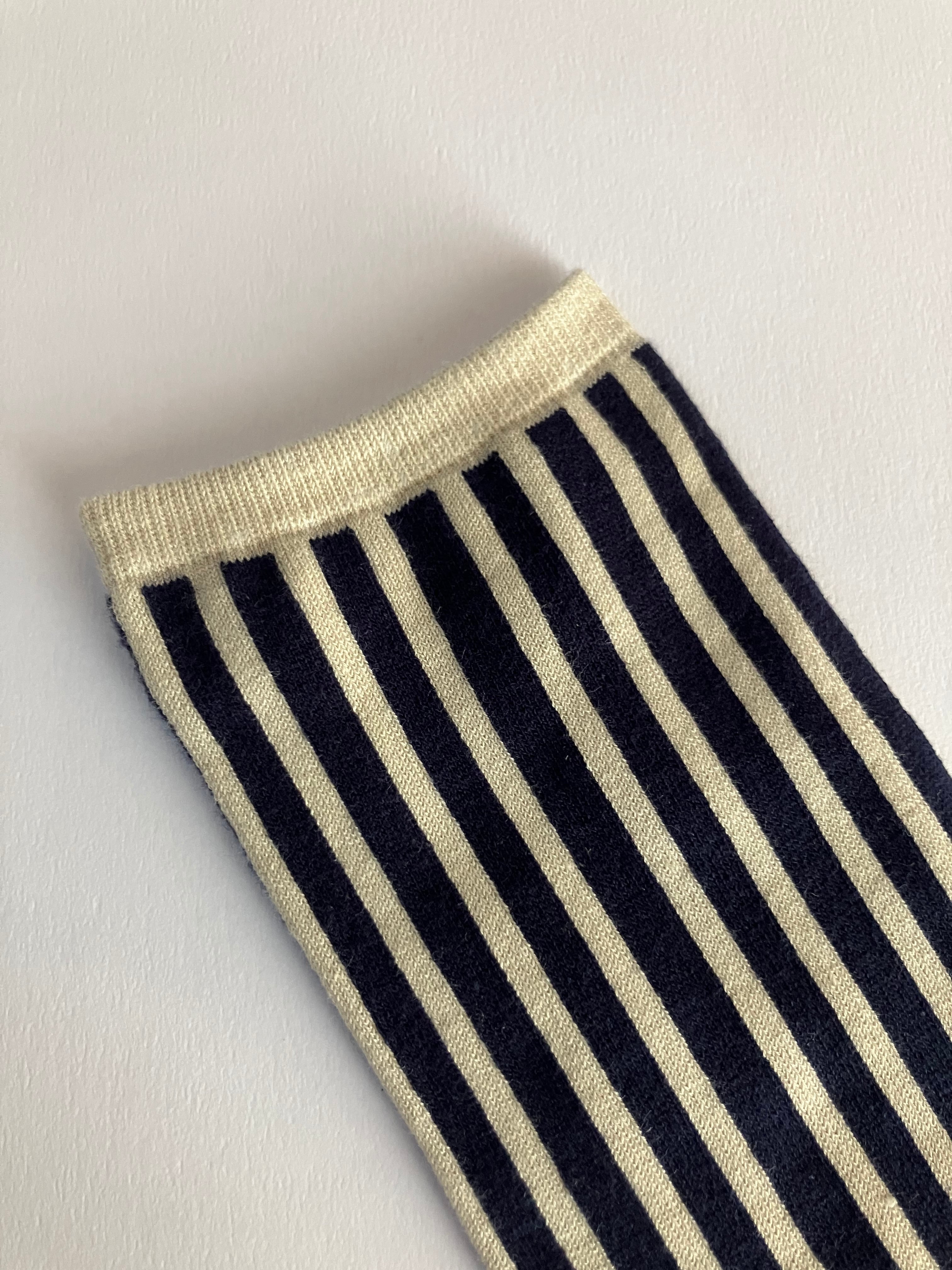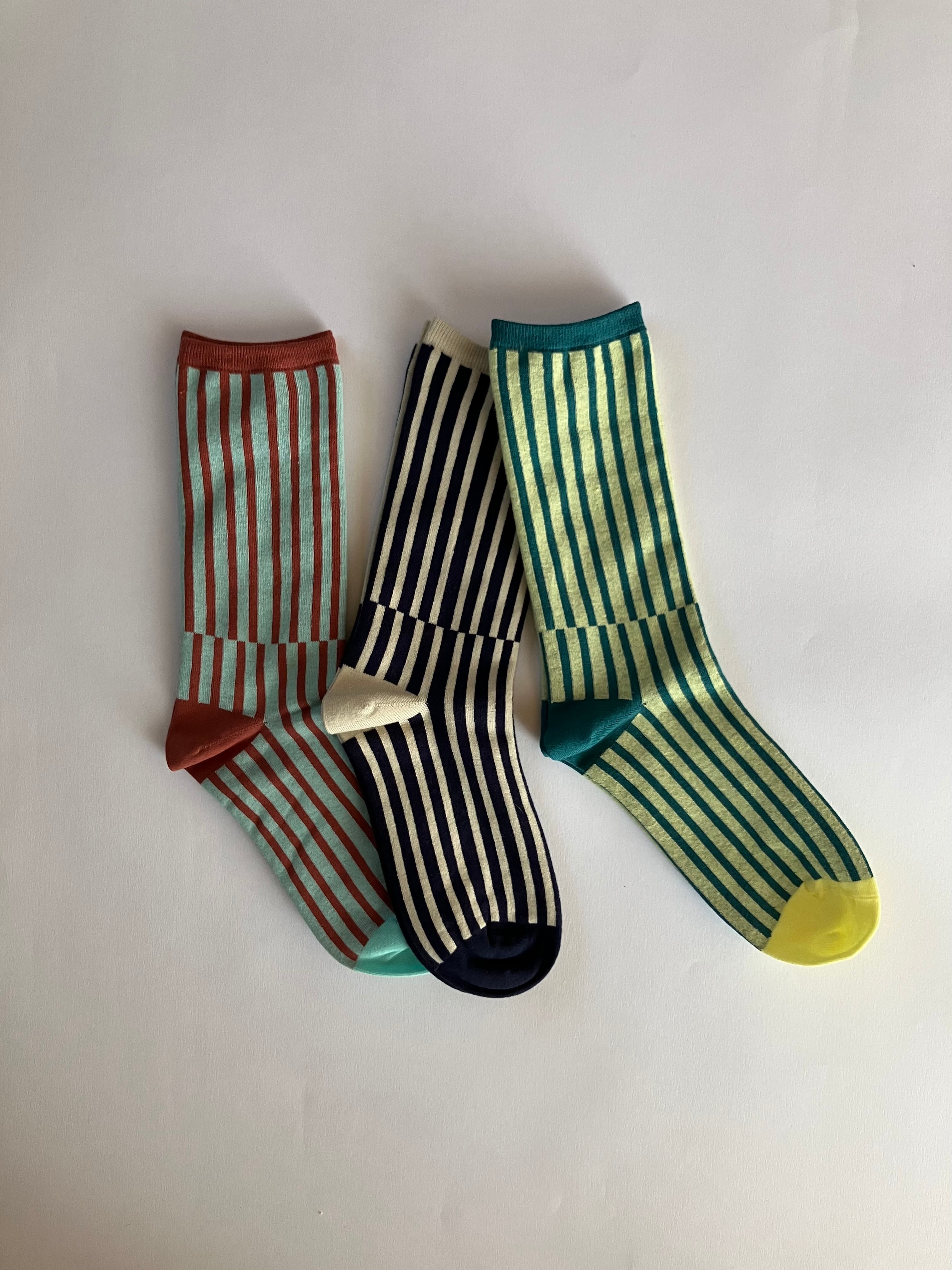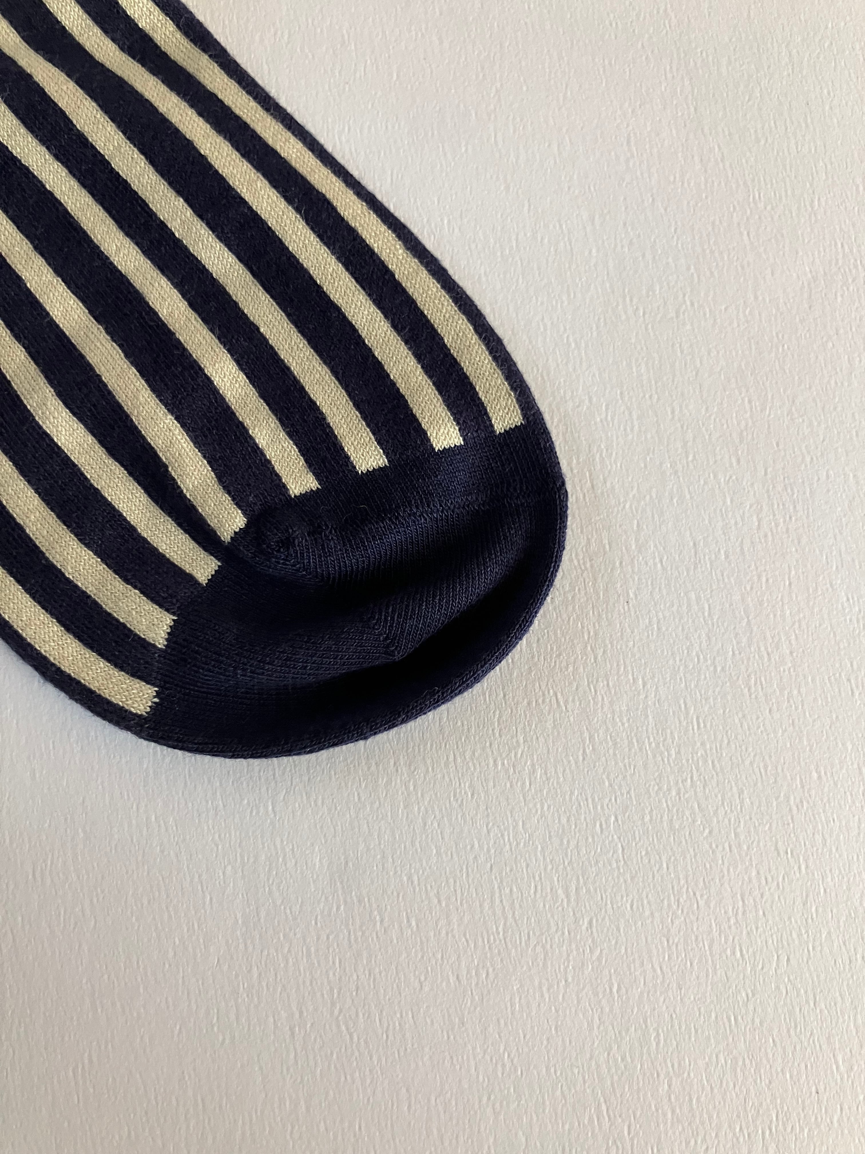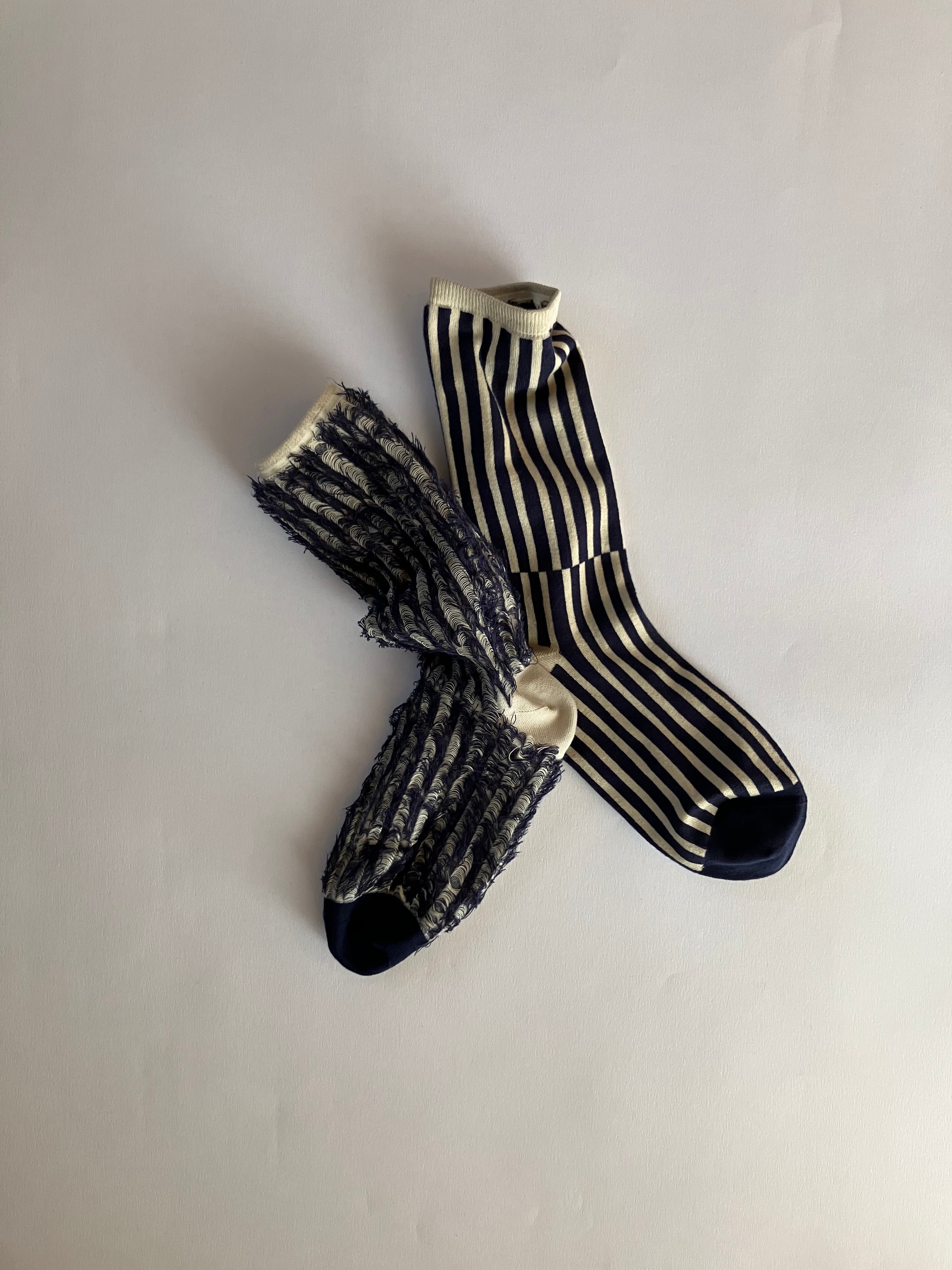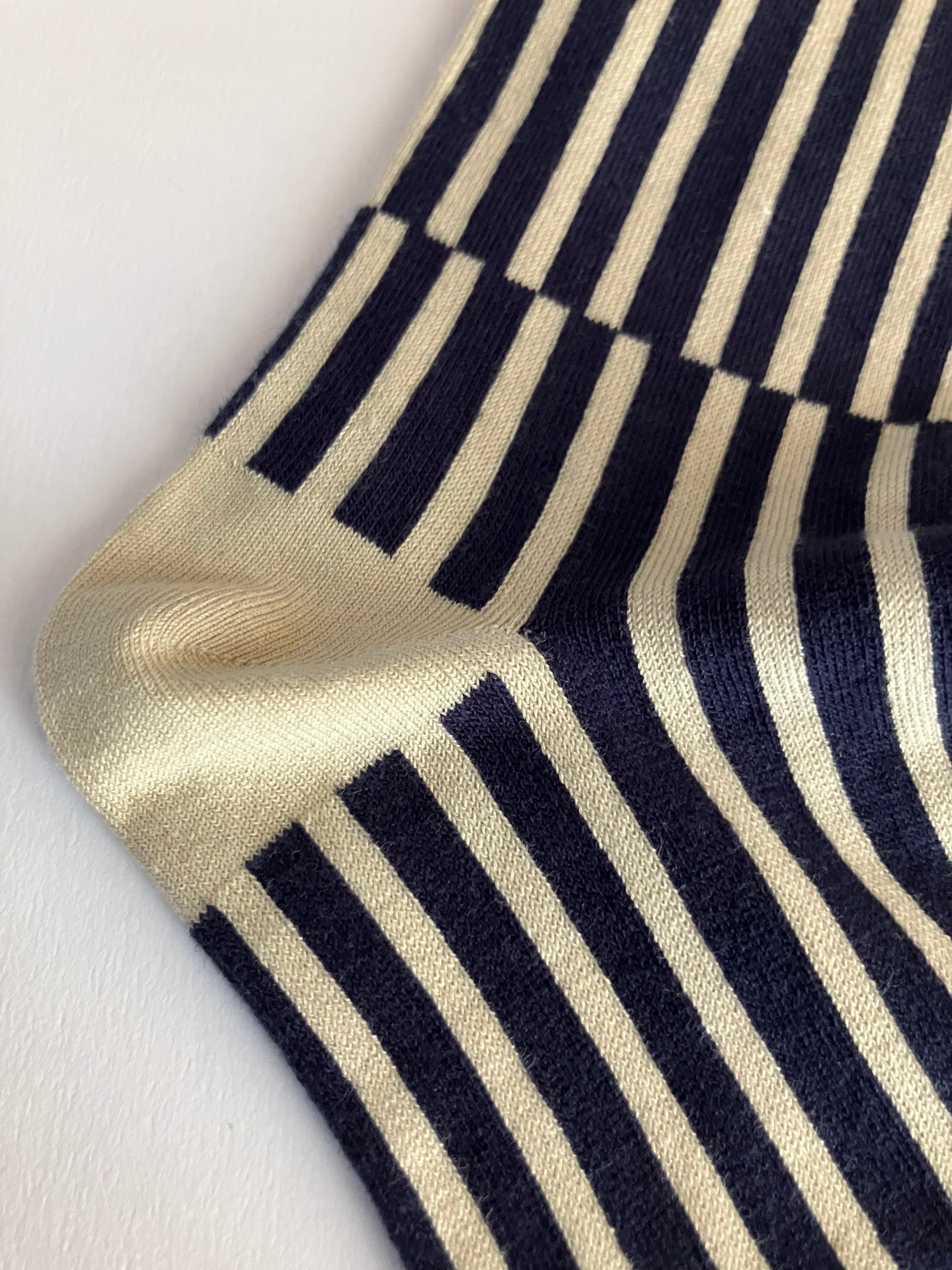 細番手のコットンをベースに毛羽の少ない均一なコットンを柄糸にした、2wayソックス。途中で柄を切り替えた、騙し絵風のストライプがかわいいです。