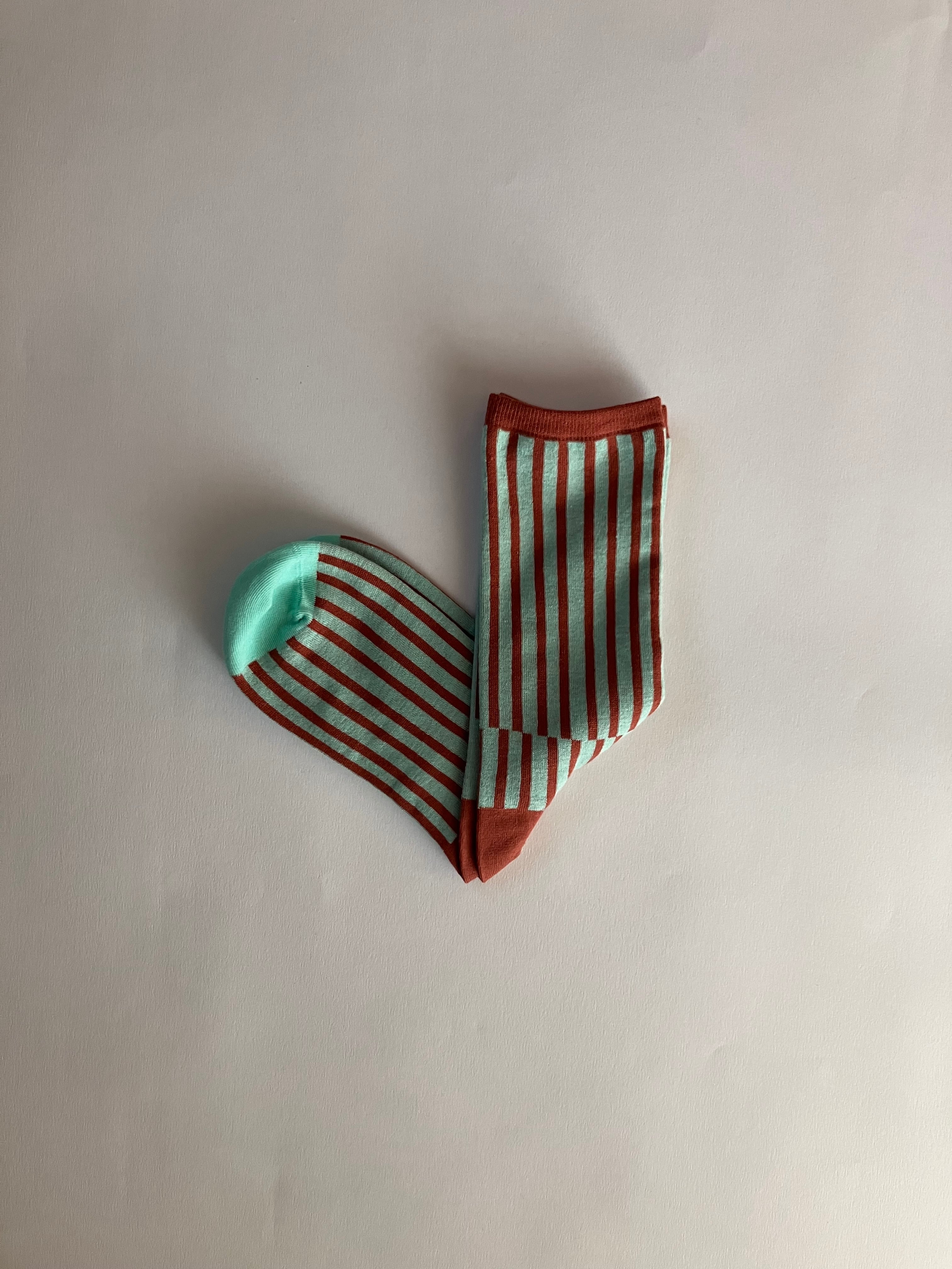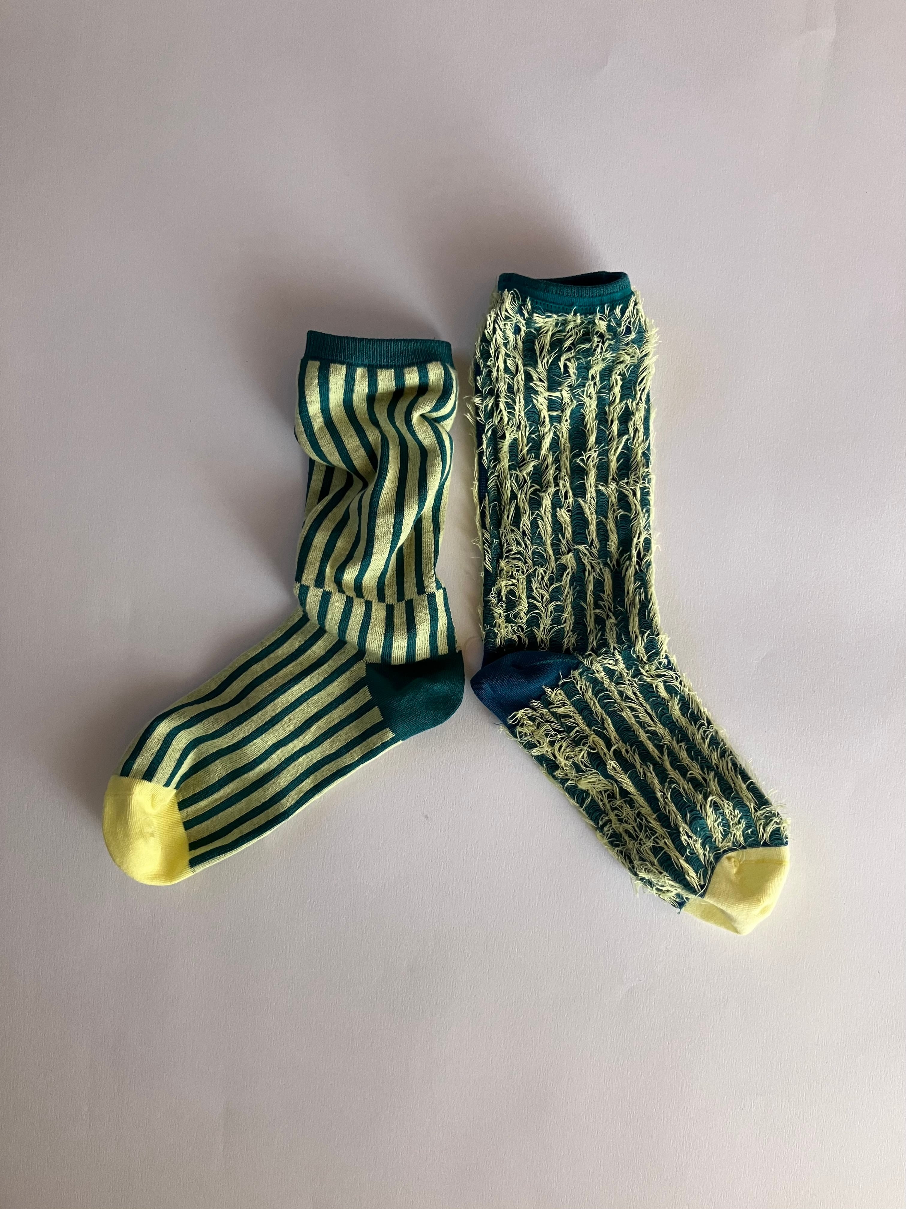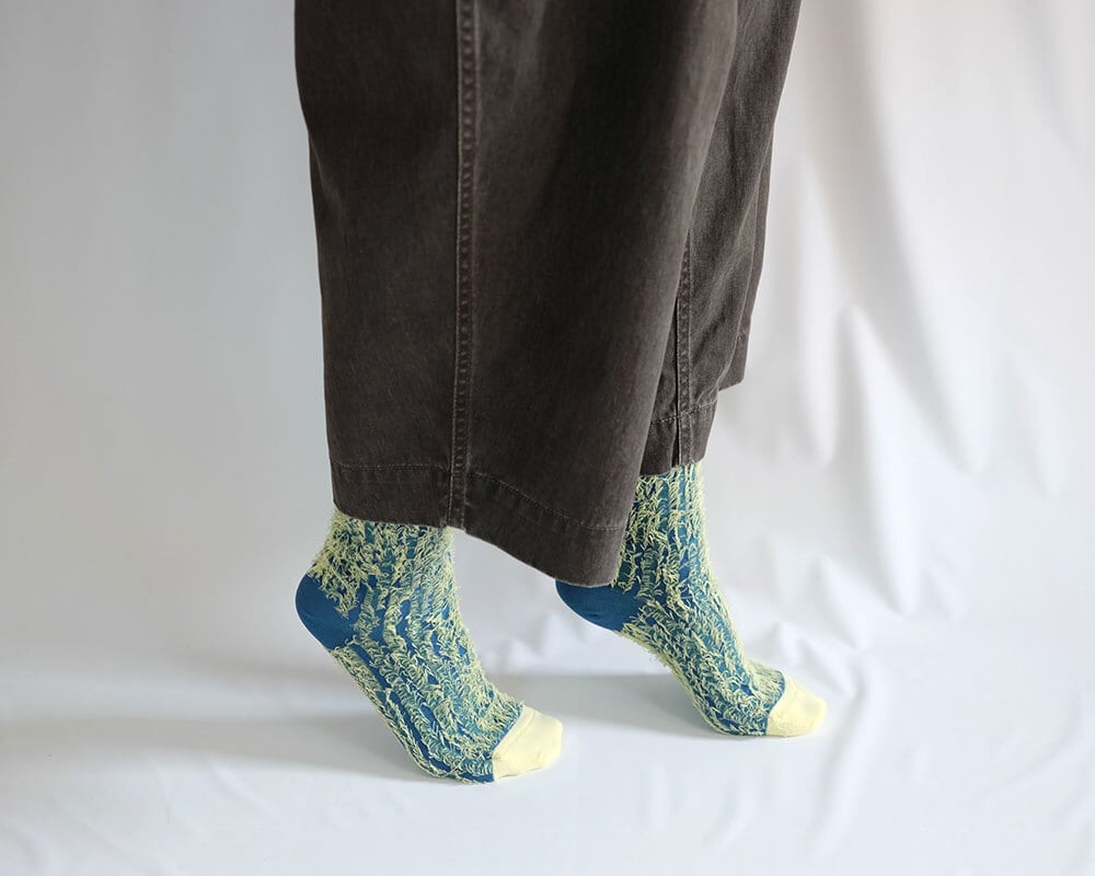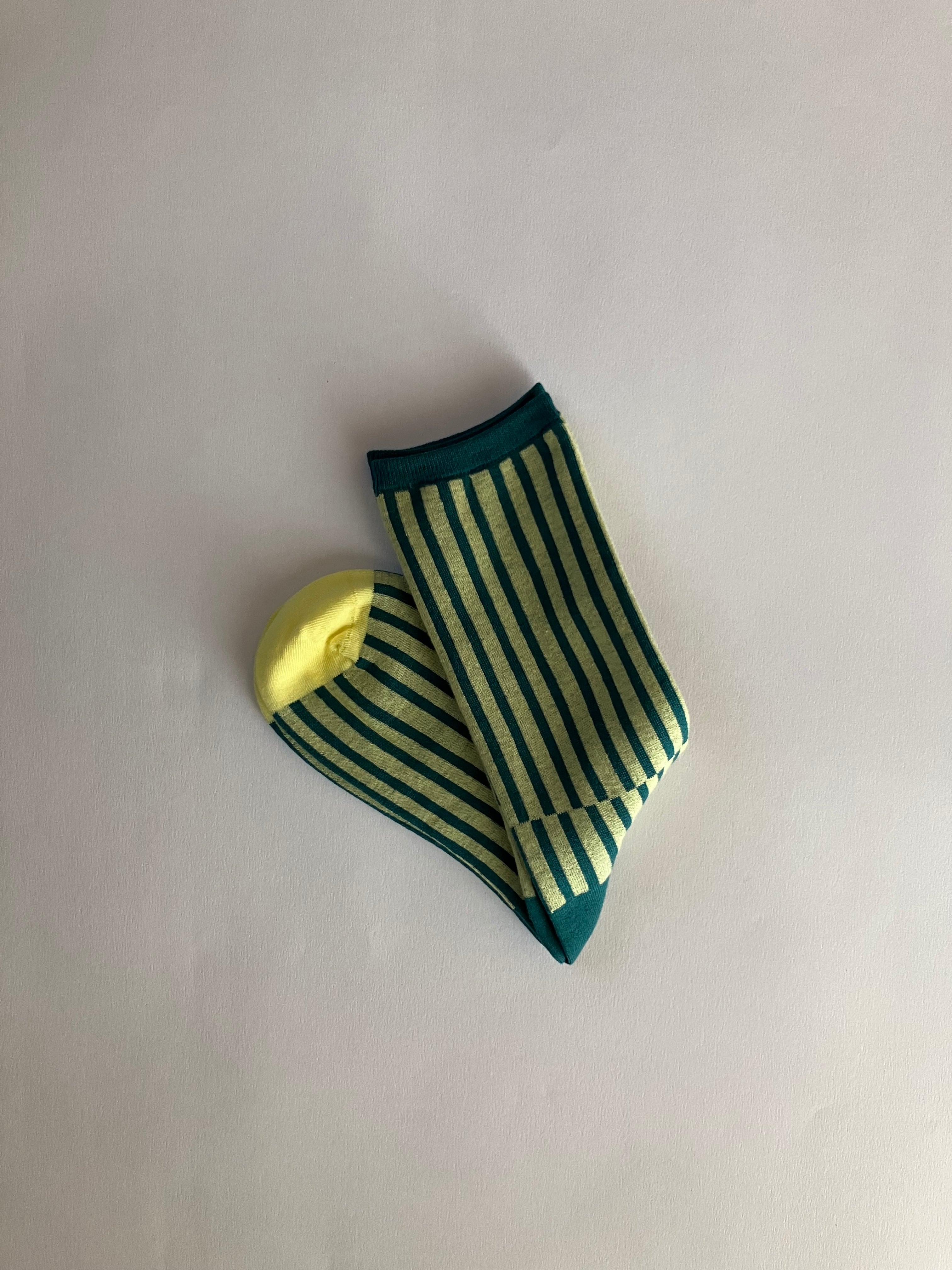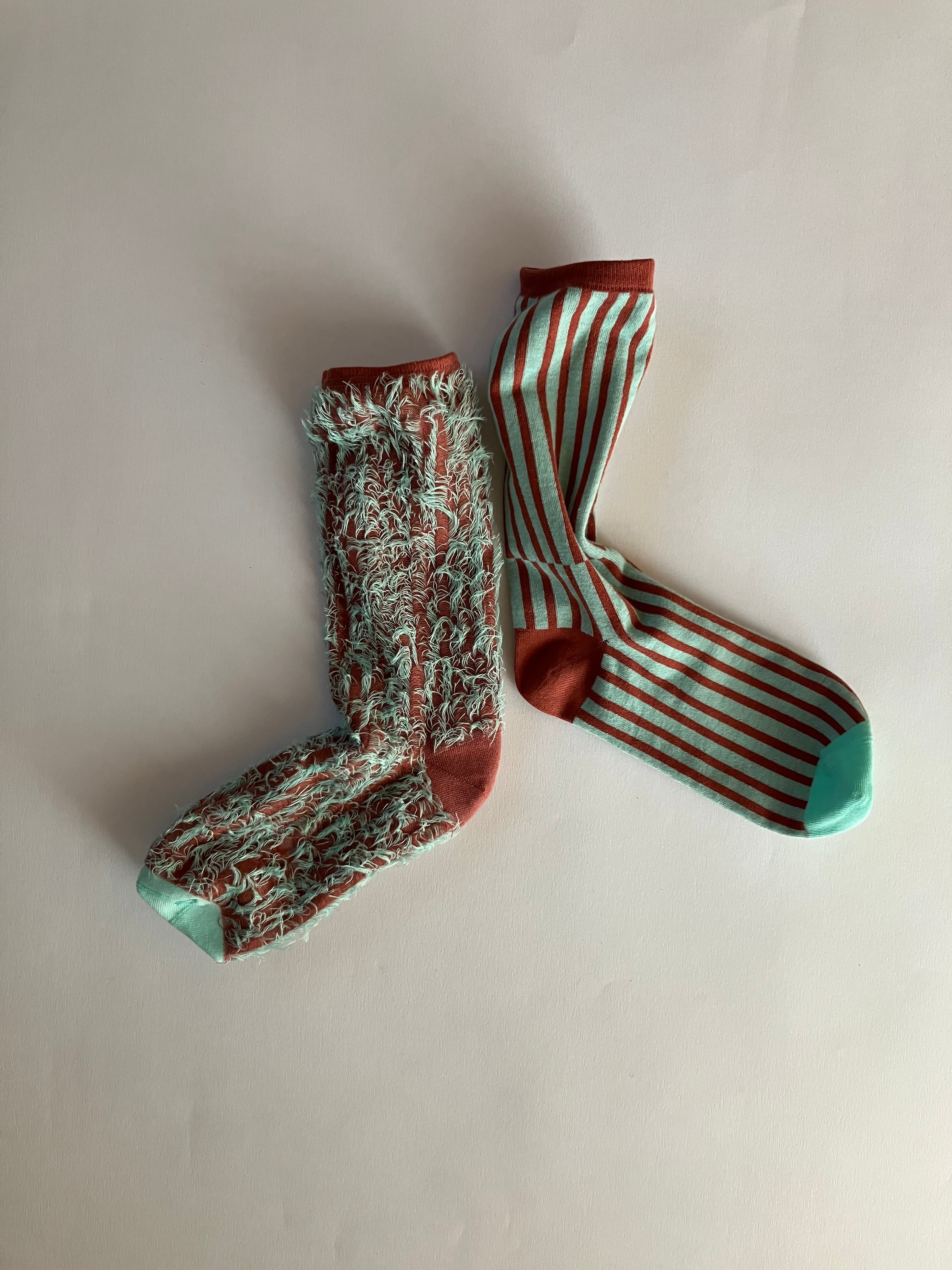 細番手のコットンをベースに毛羽の少ない均一なコットンを柄糸にした、2wayソックス。途中で柄を切り替えた、騙し絵風のストライプがかわいいです。