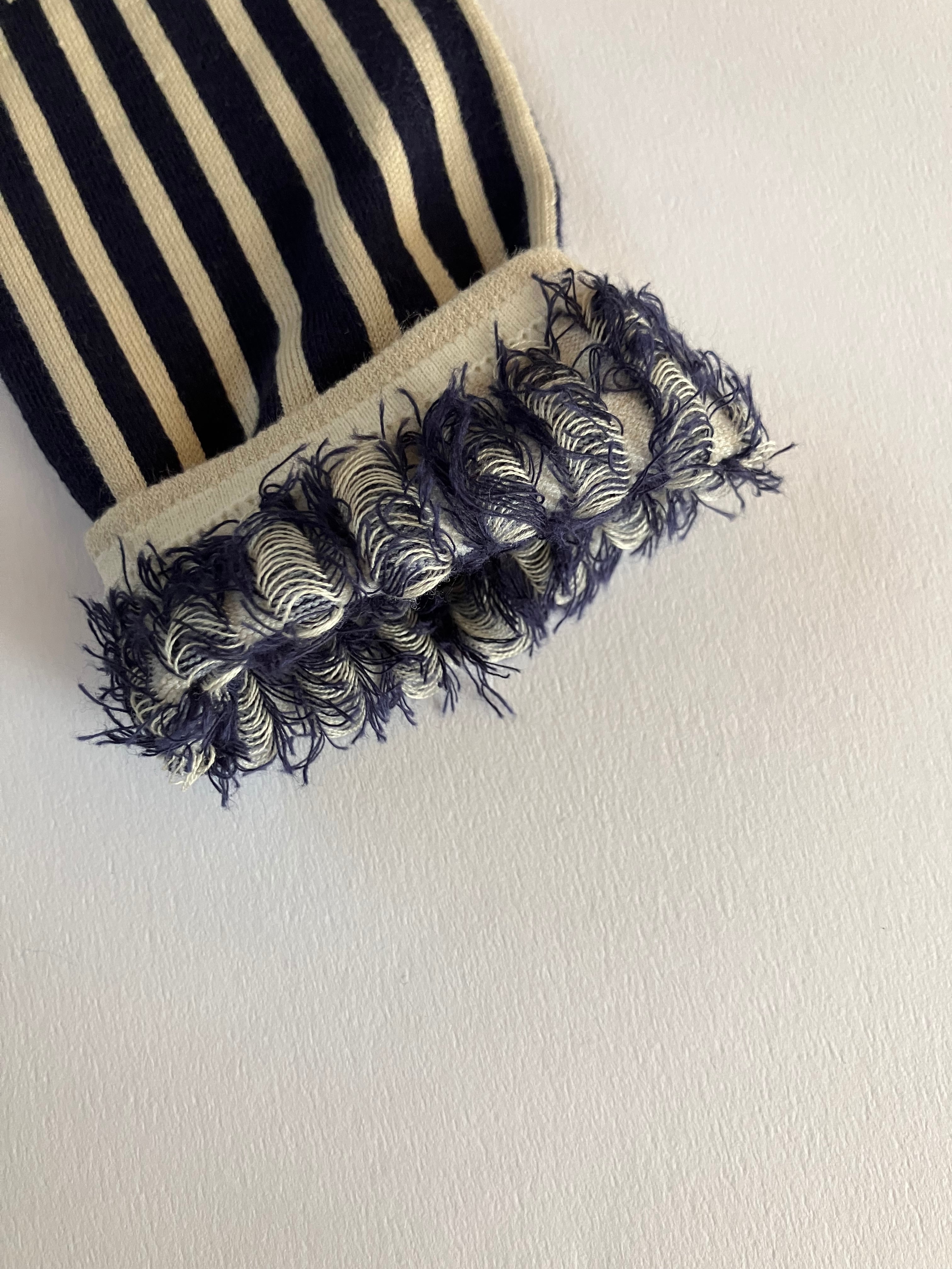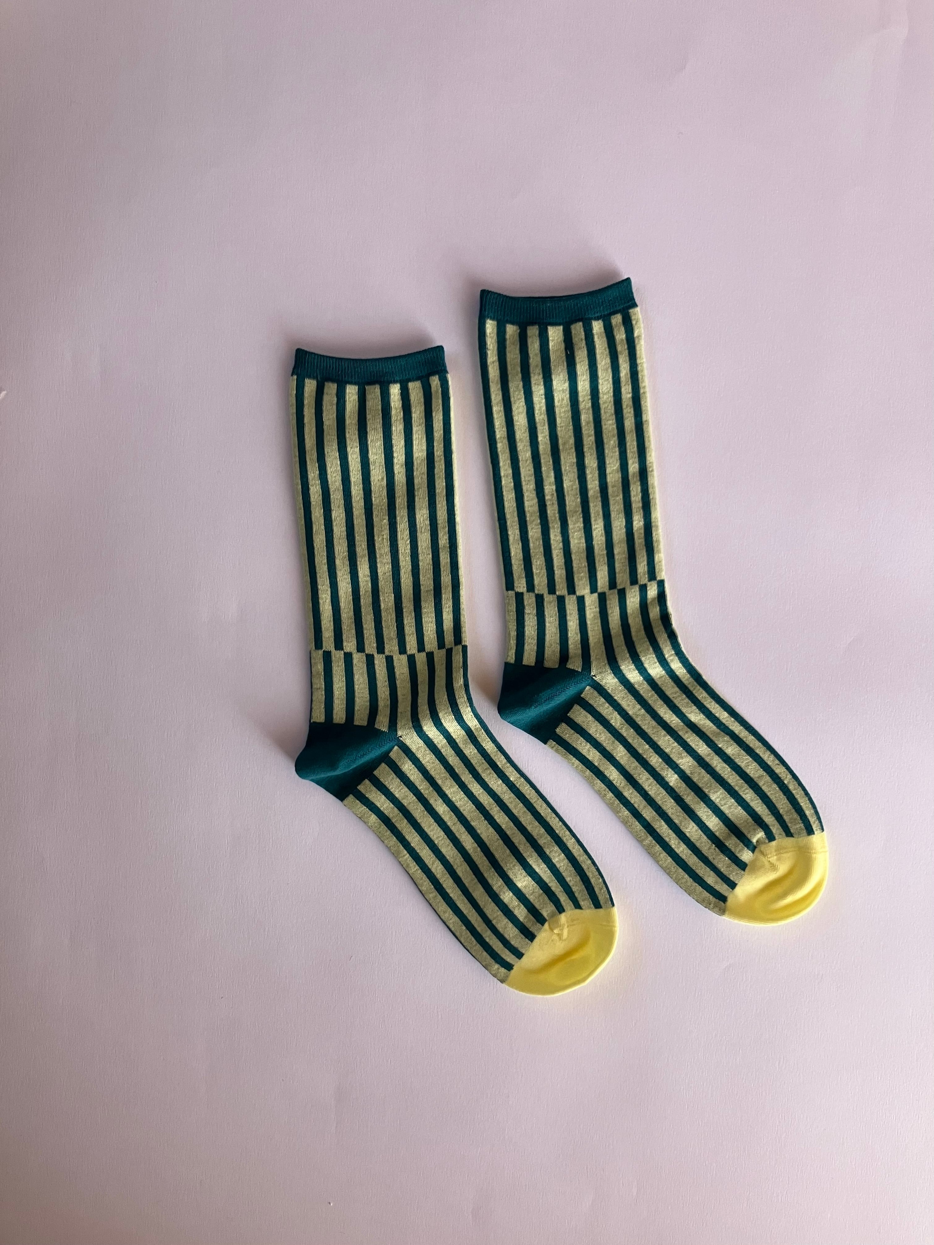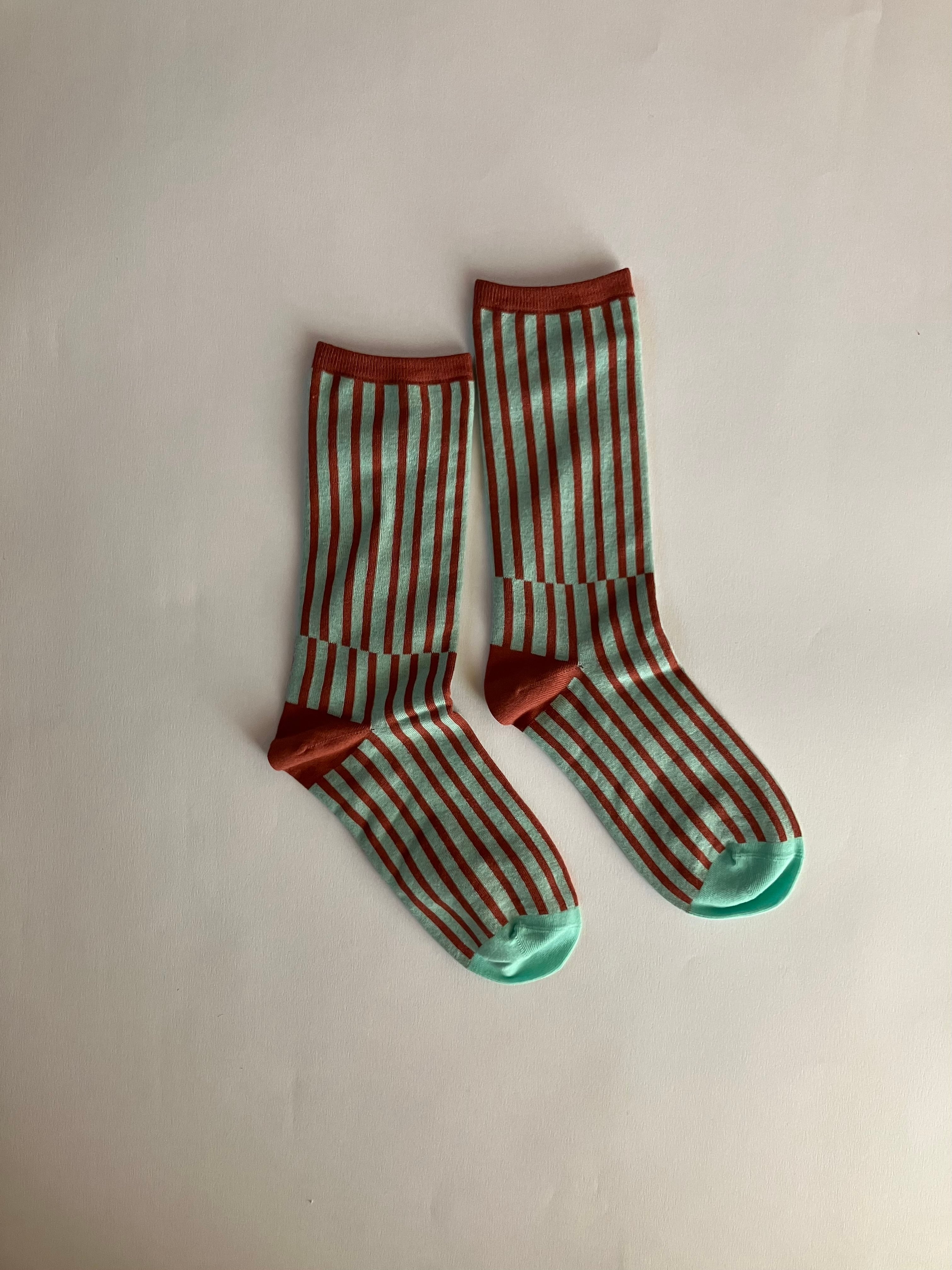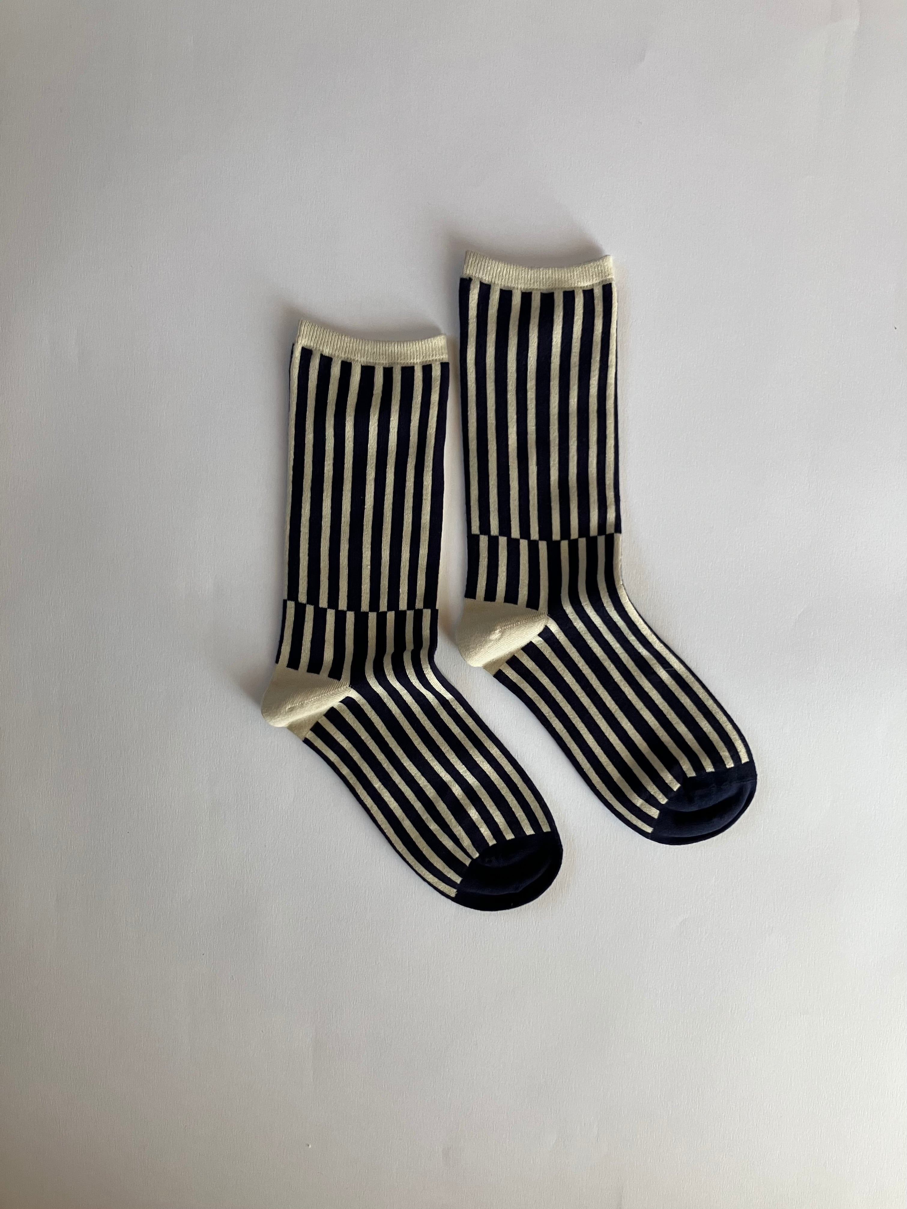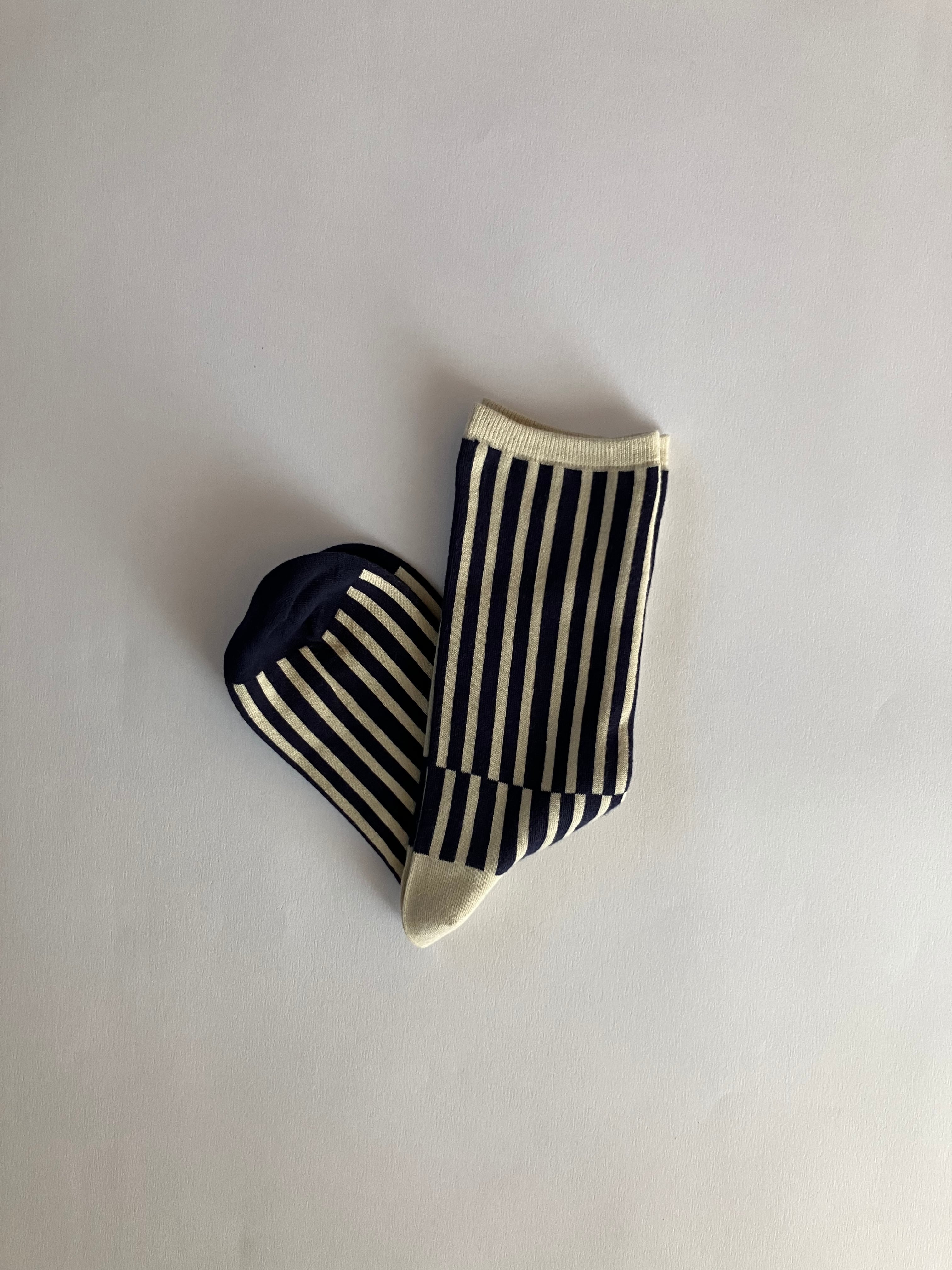 細番手のコットンをベースに毛羽の少ない均一なコットンを柄糸にした、2wayソックス。途中で柄を切り替えた、騙し絵風のストライプがかわいいです。