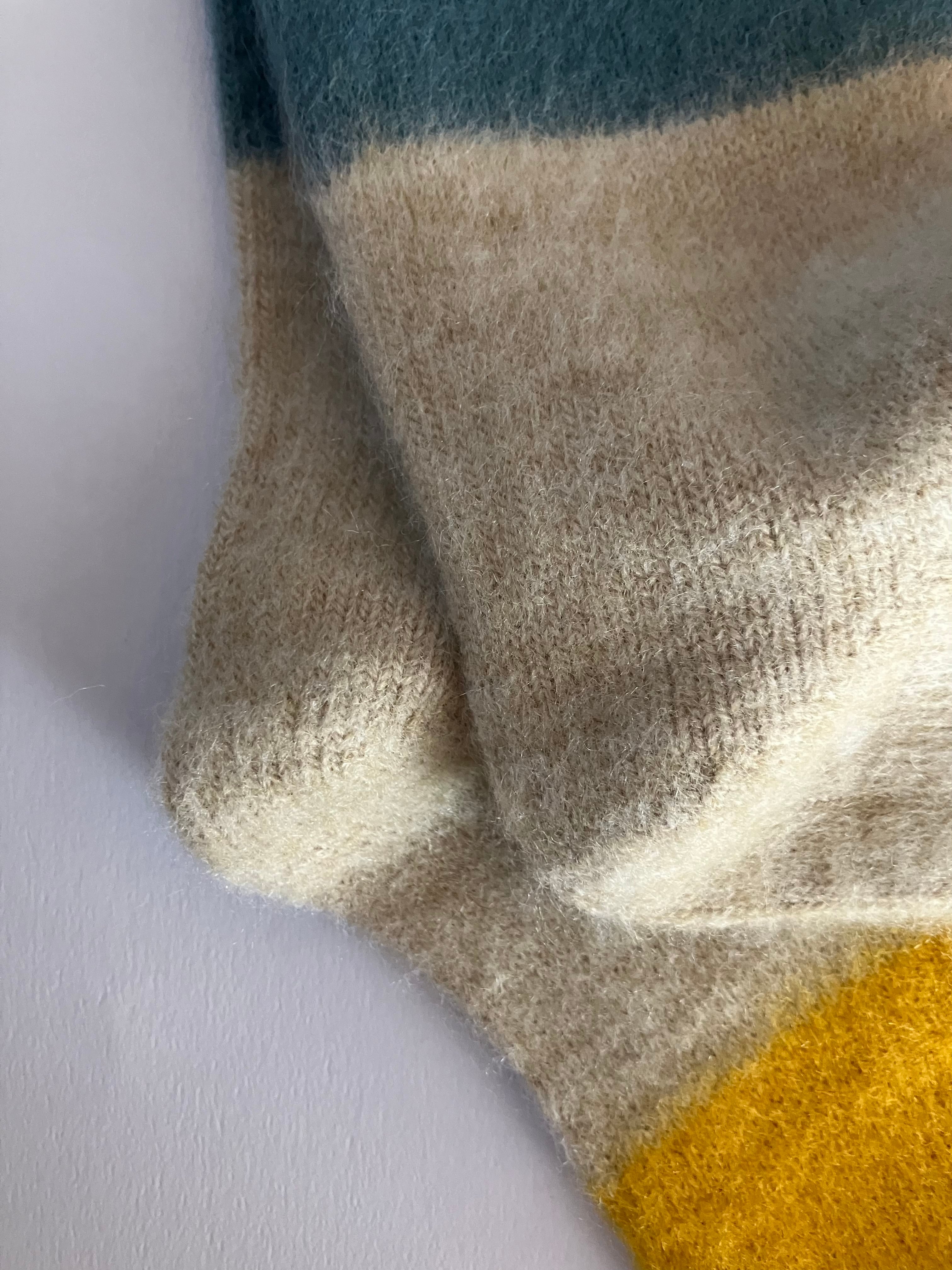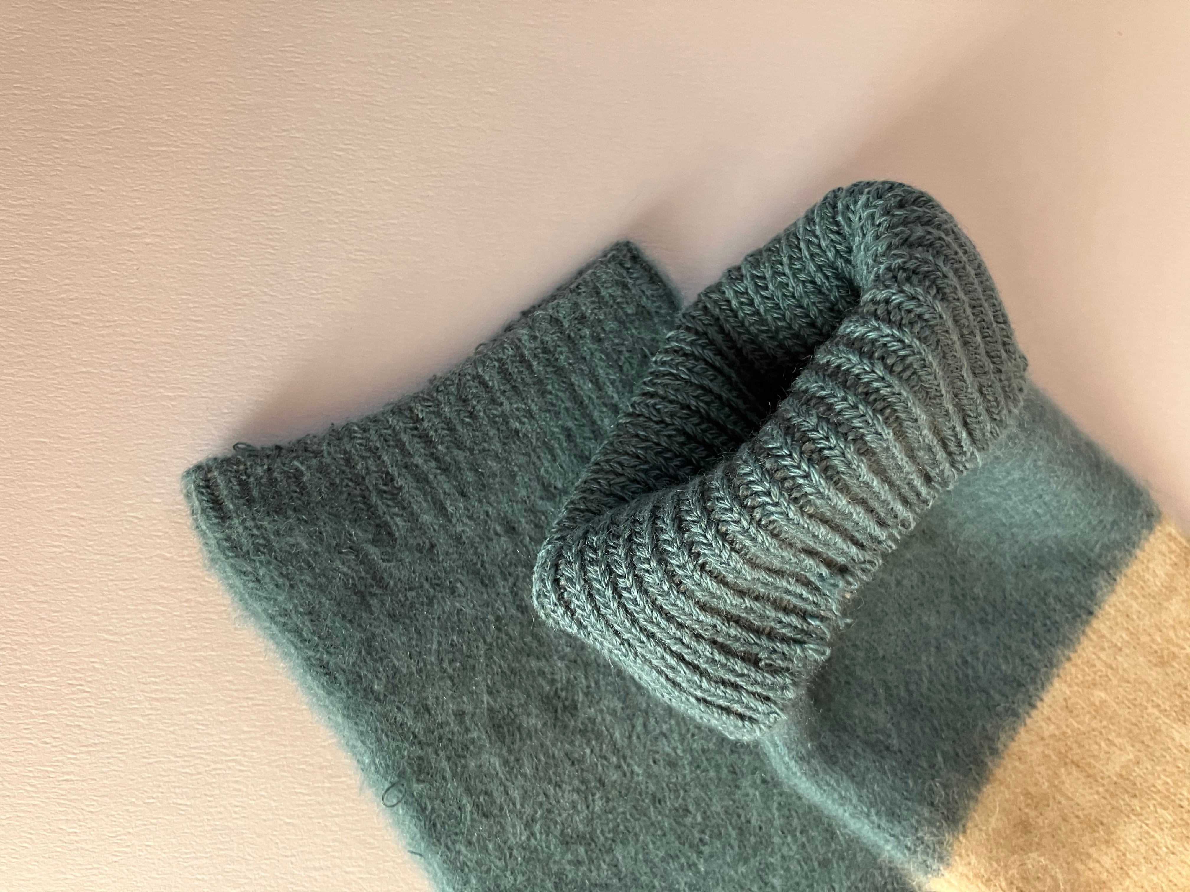 コットンとアクリルウールを引きそろえた編地に、起毛をかけて表面をふわふわに。冬の着こなしのアクセントに。