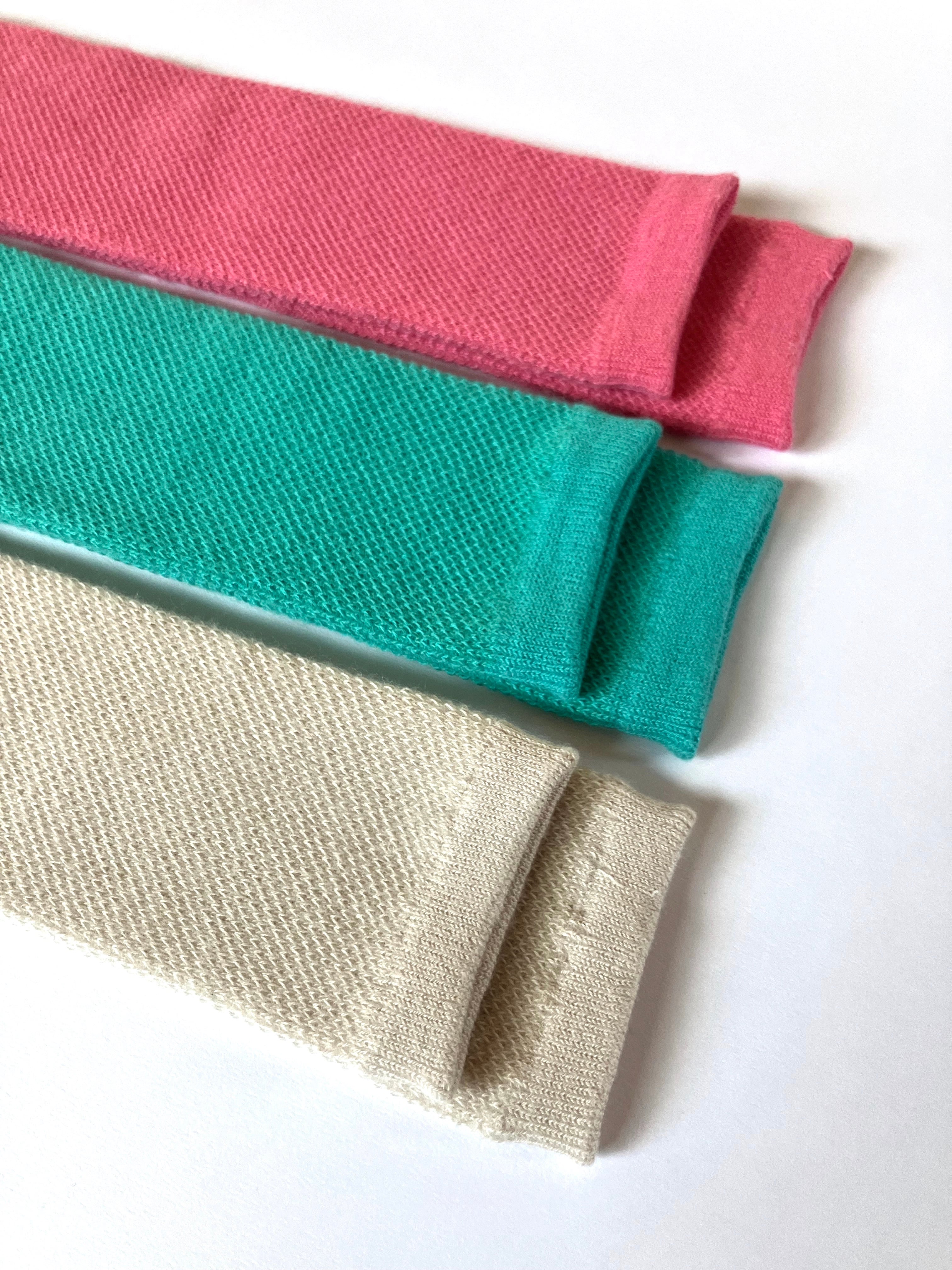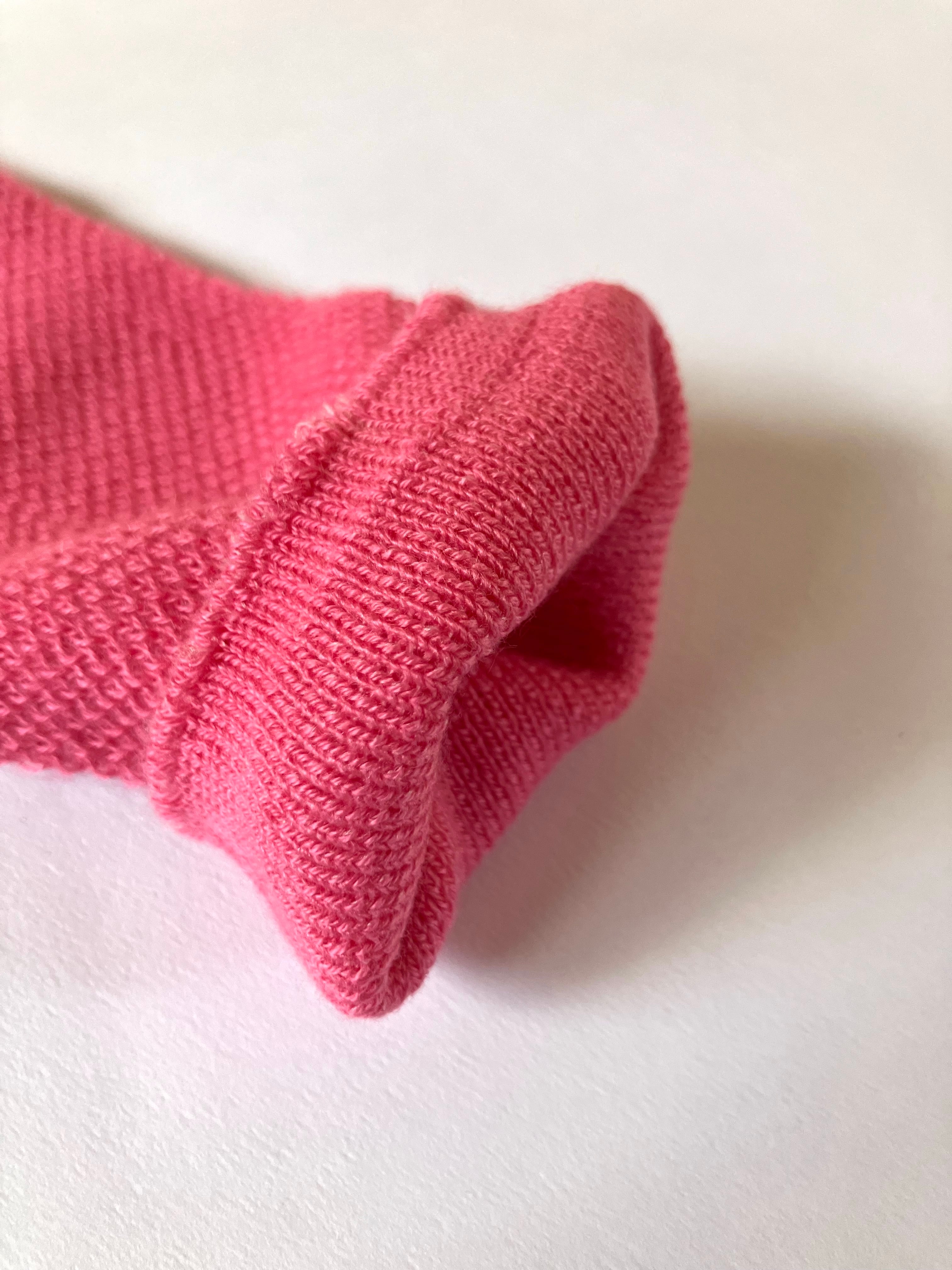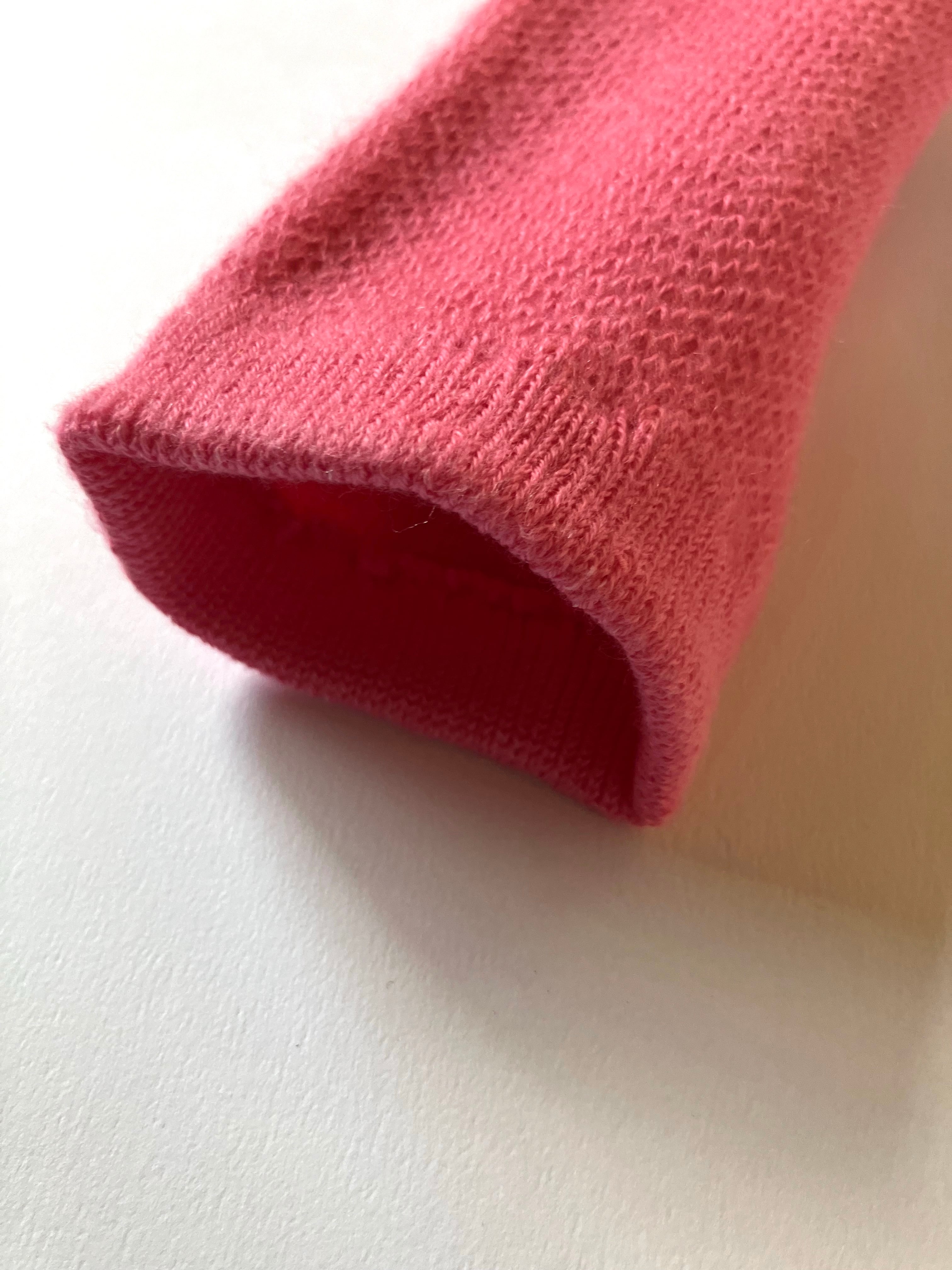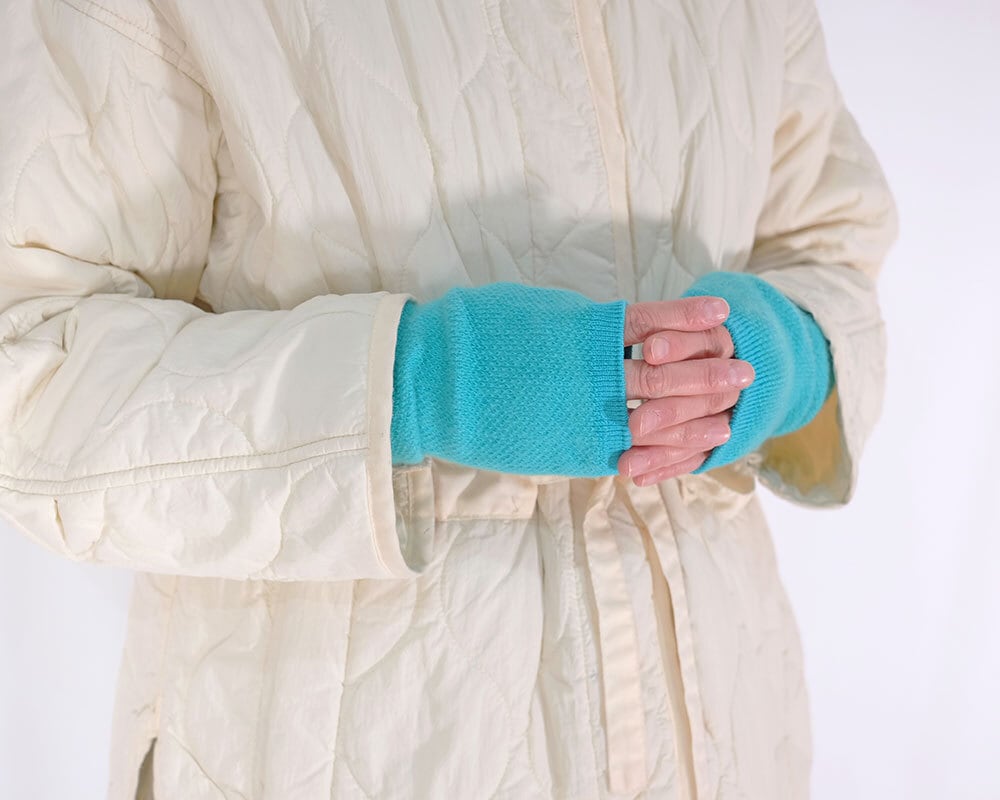 ベースはコットンとアクリルウール。2種類の異なる糸を一目ずつ交互に編むことで、シンプルながら表情のある仕上がりに。ふわふわで伸びがよく、コートの袖口からのぞかせたい美しいカラーも魅力。クリスマスの贈りものにも。