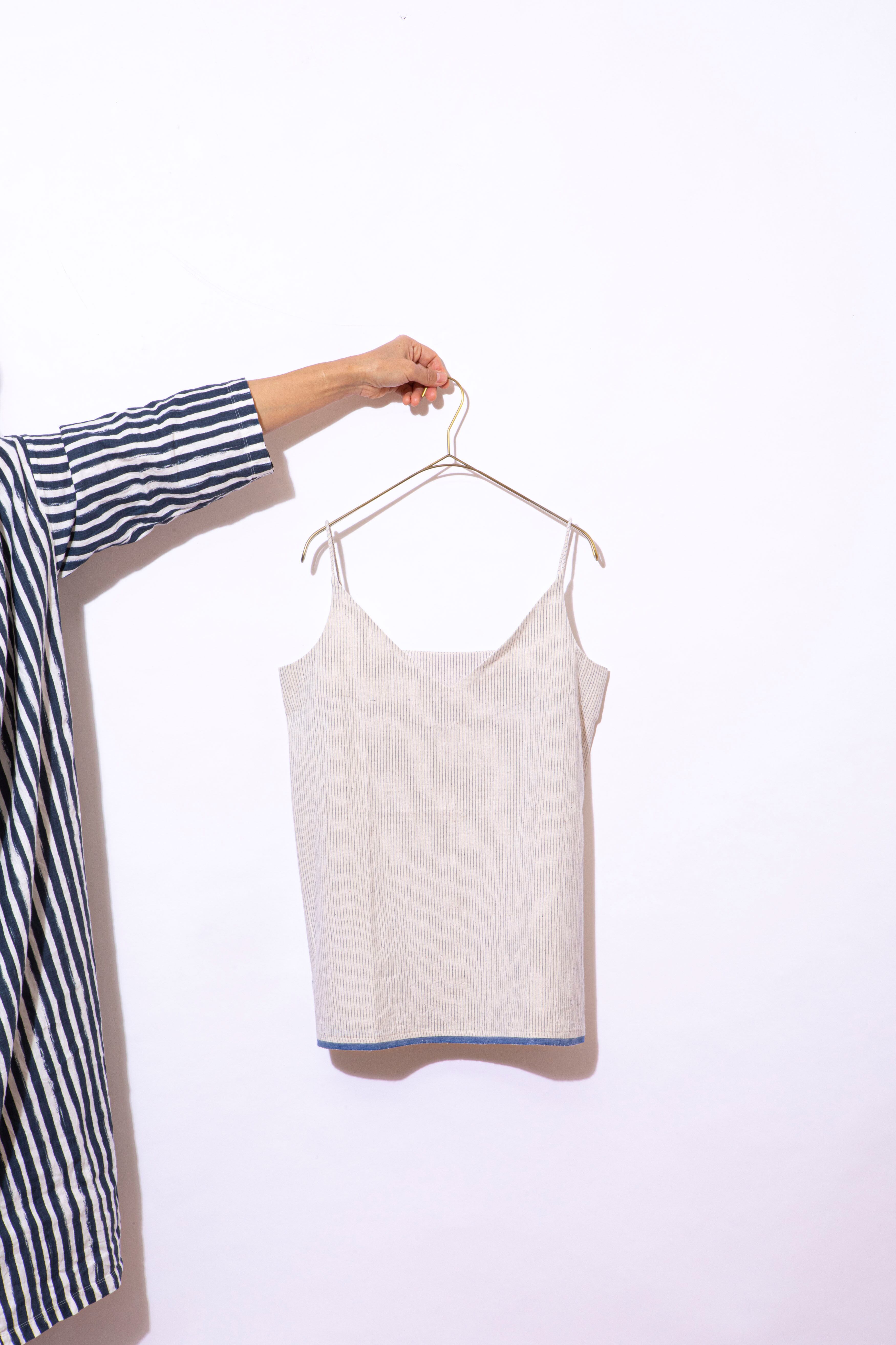 30番手のカディコットン生地(手紬ぎ手織りの生地)で仕立てたキャミソールトップス。肩のストラップは、共布の丸紐で作られています。そのまま着たり、重ね着したり、幅広いコーディネイトをお楽しみいただけます。