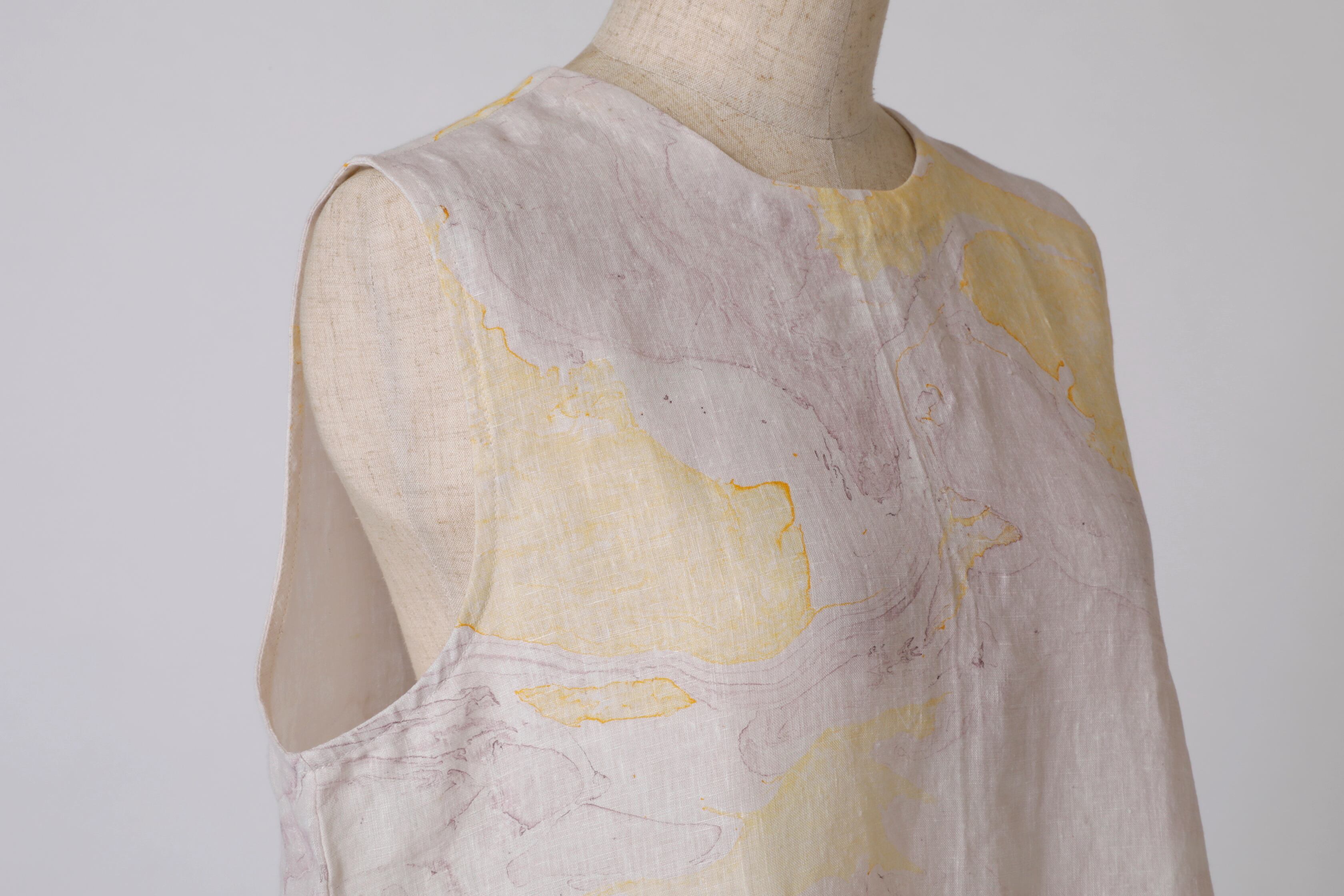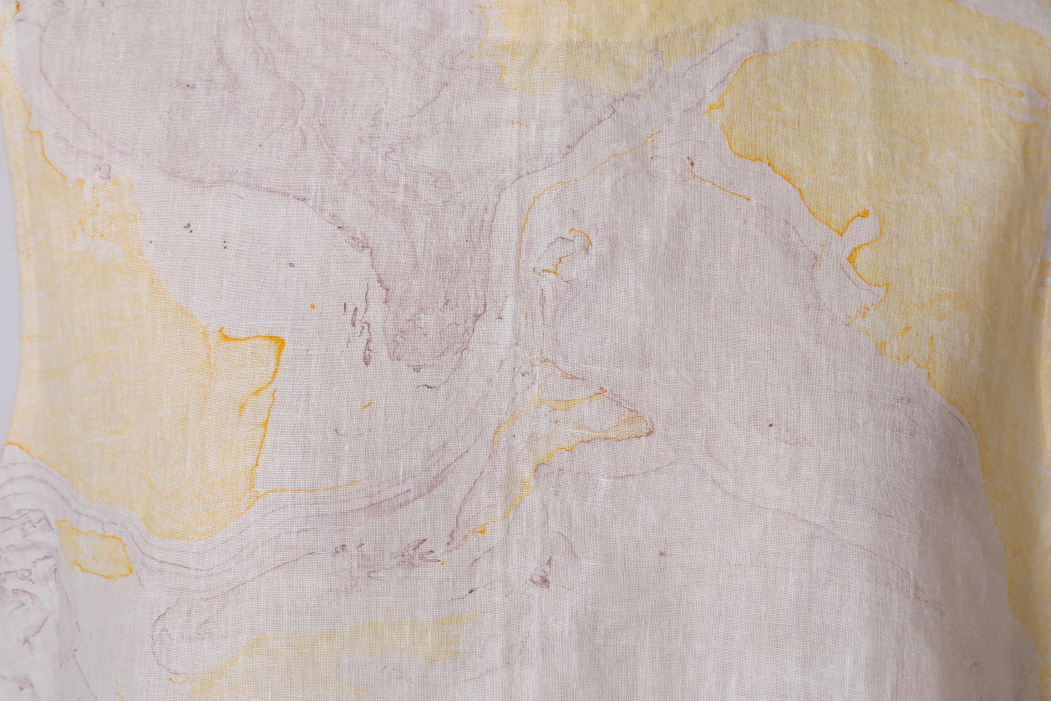 生地は、柔らかなハリのある薄手リネン。インドの職人の手による伝統的なマーブリング染めが施されています。二つとして同じ柄がなく、ユニークな表情をお楽しみいただけます。