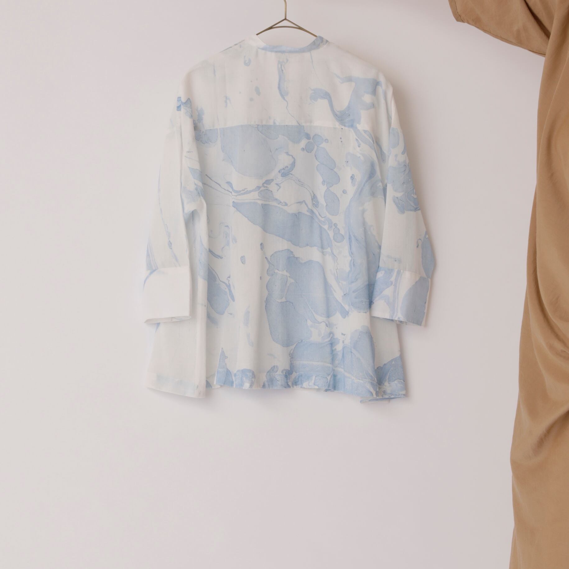 フロントは比翼仕立てで、三つのボタン付き。首元の控えめなギャザーに、七分袖とバンドカラーのコンパクトさ、ゆったりとした見ごろのバランスが絶妙で、美しいマーブリング染めと合わせて、なかなかお目にかかれない一着だと思います。