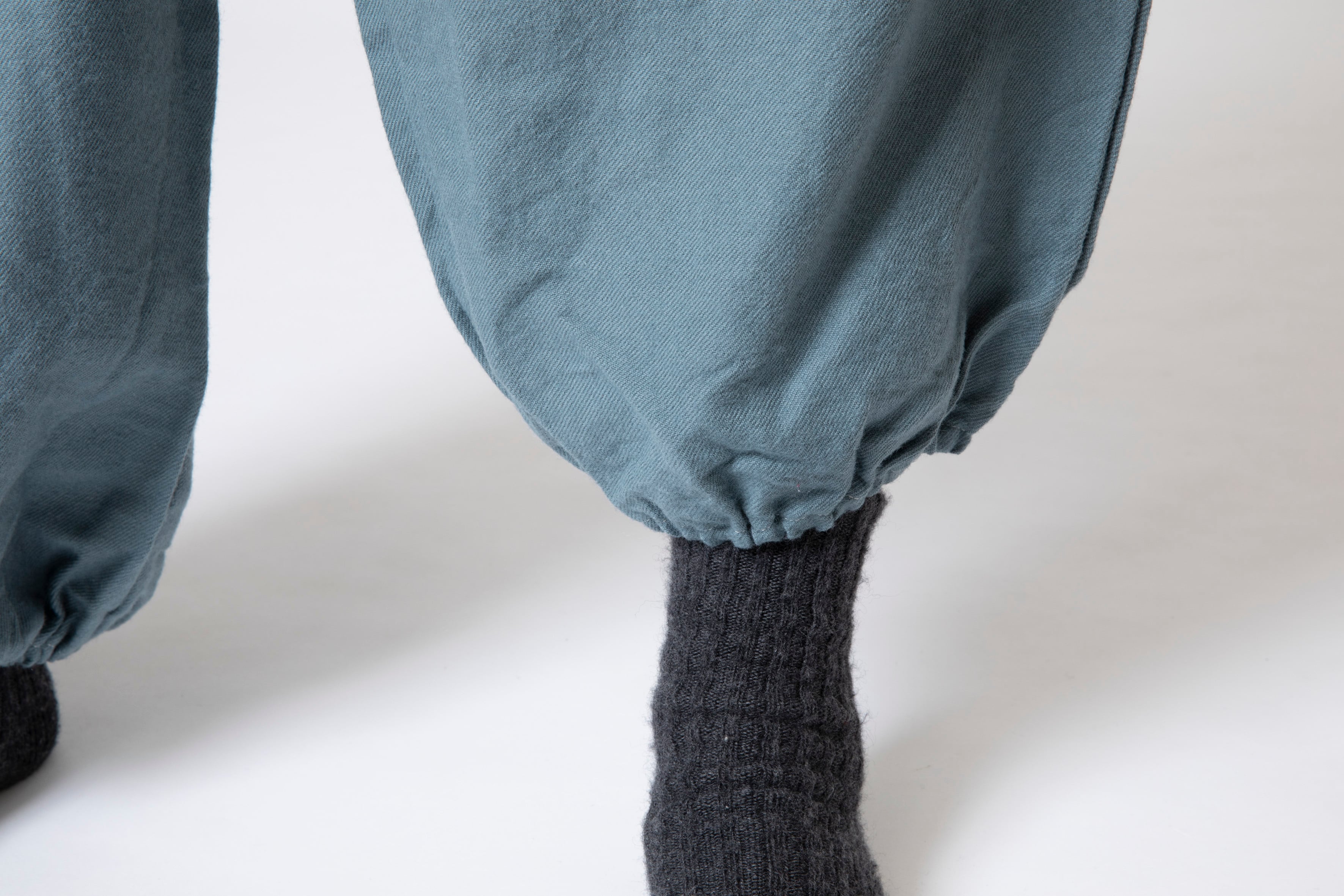 サイズはフリー。たっぷりと生地を使用し、厚手のニットにも重ねられる楽ちんシルエットですが、上質な素材感に加え、ウールのヘリンボーンテープ、アクセントのカラーステッチ、両サイドのポケット生地など細部に至るまで美しいあしらいが施されています。それゆえ、ほっこりとした印象にはならないところが店主は好きです。