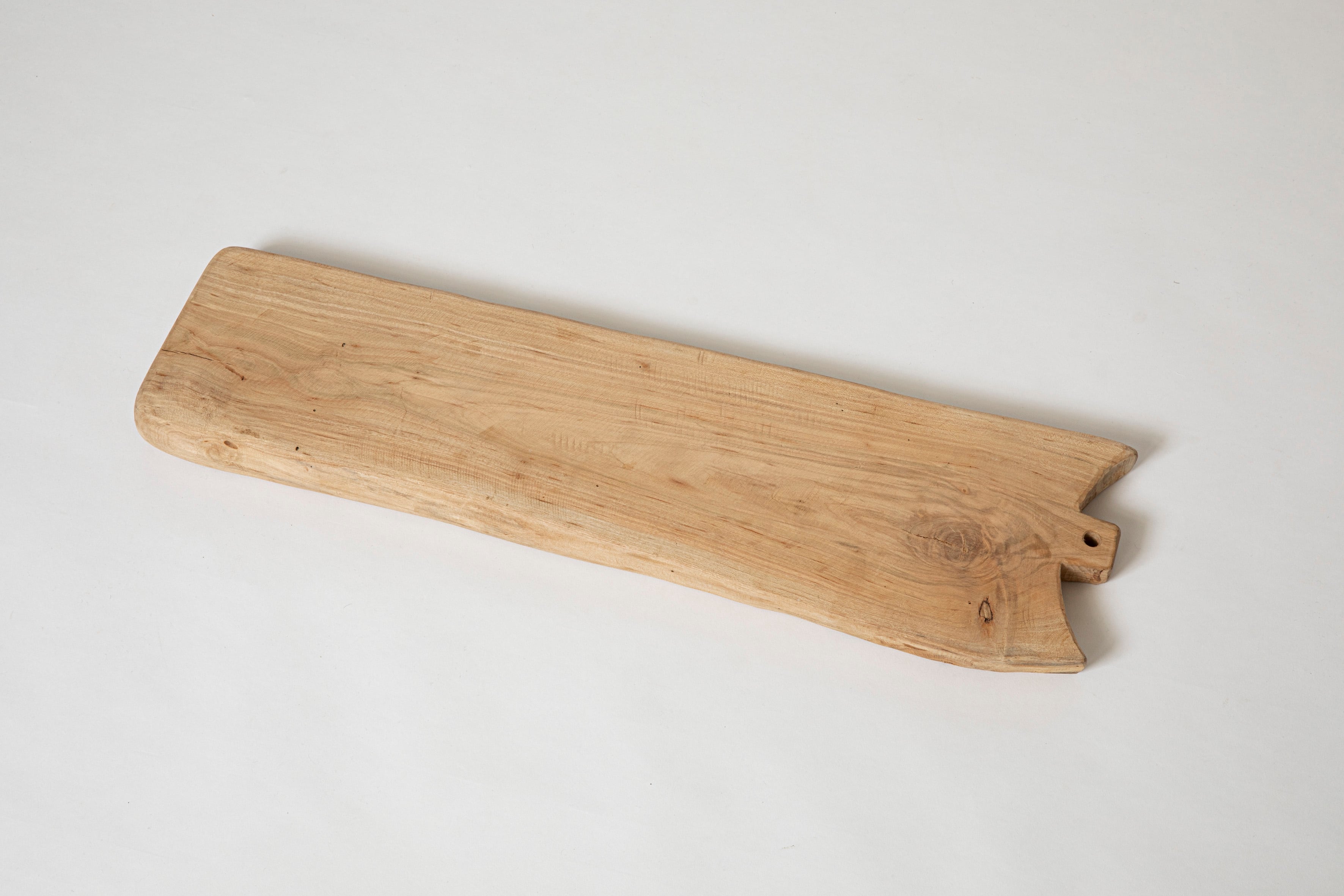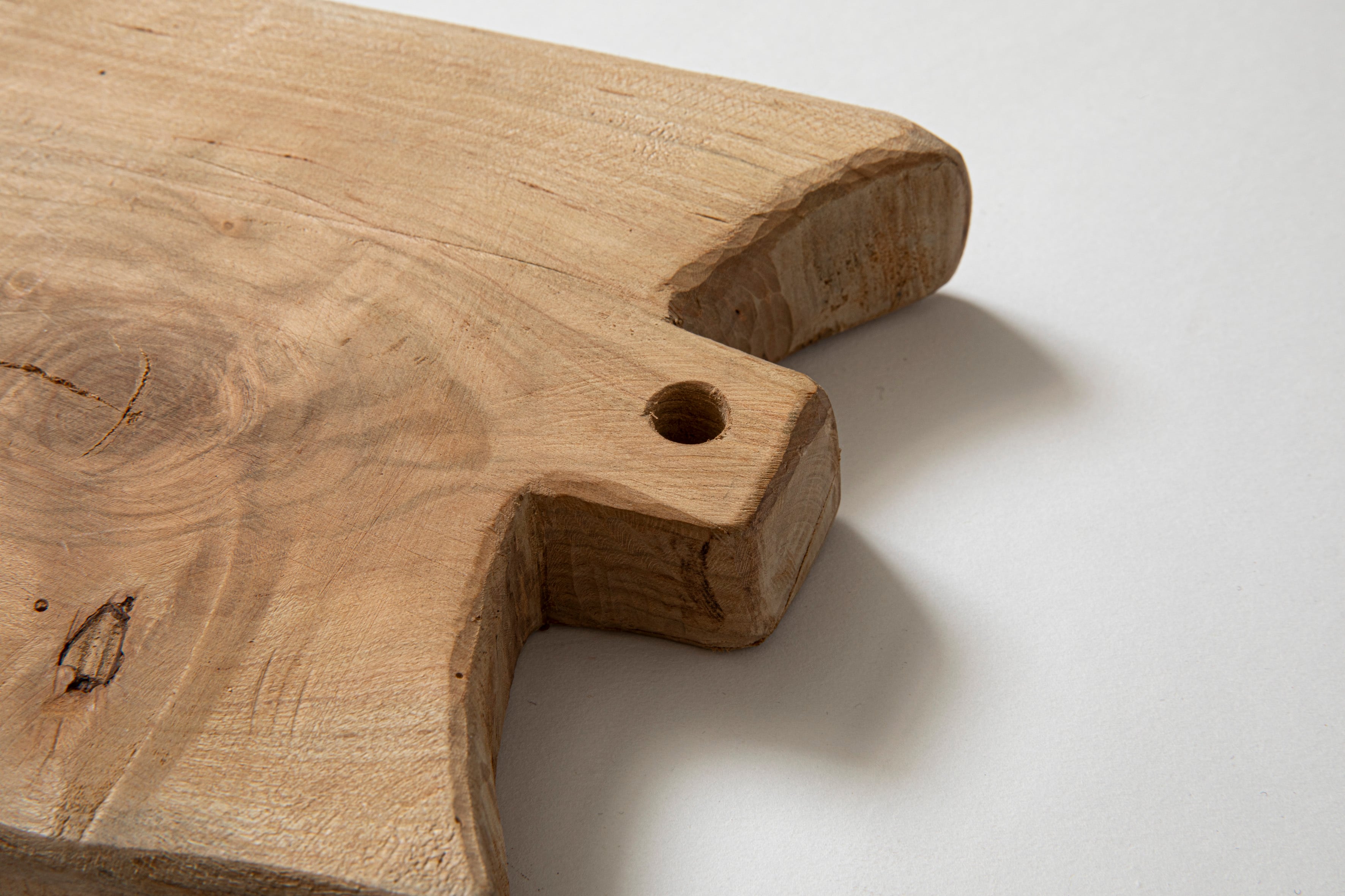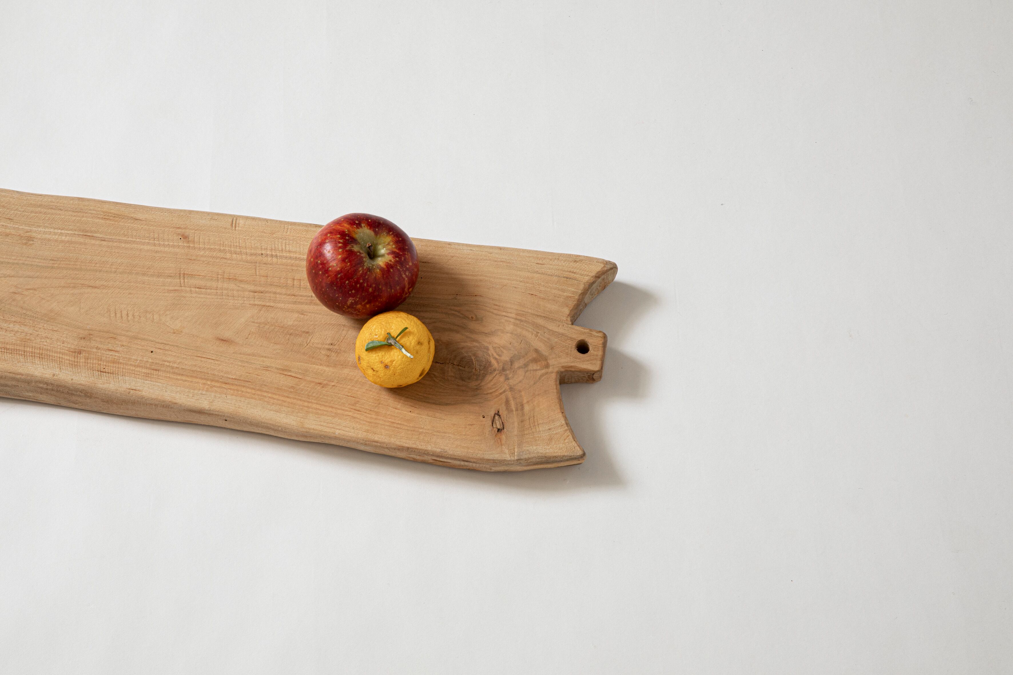カッティングボードという名称ですが、まな板として使用されるとガタつきが気になると思います。長さもあり、いびつな形が何ともかわいいので、リビングテーブルに置いて乾きものをあれこれ盛りつけても。用途に応じてオイルを塗ってご使用ください。