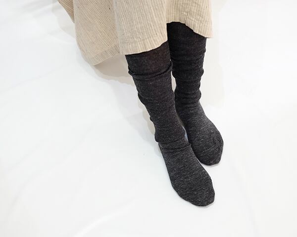 リネンをシンプルな細リブでざっくりと編み上げたハイソックスです。「めちゃハイソックス」と呼んでいるほど長いです。